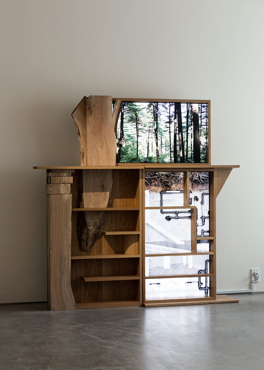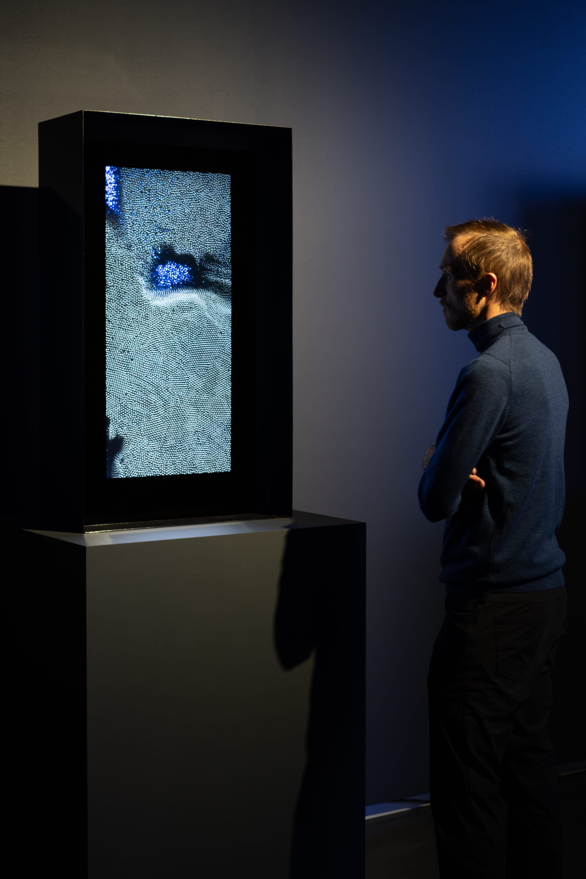 MAXIM ZHESTKOV, Playscapes, 2026, digital sculpture, screen inside aluminum frame, 58 x 99 x 26 cm. Copyright James Medcraft. Courtesy the artist and BOUNDED SPACE (left); and MINJEONG GUEM, The Breathing Eyes, 2022, sculpture with single-channel video on LED screen, 170 × 170 × 30 cm. Courtesy of the artist and Art SoHyang (right).