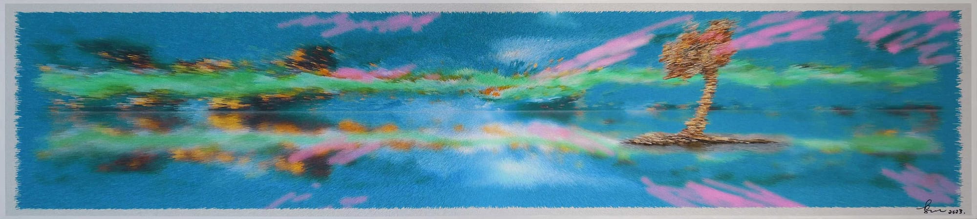 The concept of Infinite Dao derives from Daoist cosmology: “The Dao begets One, One begets Two, Two begets Three, and Three begets all things,” symbolizing the infinite pathways through which all creation unfolds. Adopting this idea, BAISHUI expresses the boundless evolution of nature and art—each work becoming a manifestation of the Dao, a tangible exploration of the intangible Way. She deconstructs a painting imbued with Daoist cultural heritage into three thousand fragments, subtly echoing the “three thousand” that signify the intricate myriad phenomena of existence. Each fragment represents a microscopic projection of the Dao. Through a proprietary algorithm, she then infuses each piece with rippling water patterns incorporating the Fibonacci spiral, allowing mathematical order to resonate with the principle of “Dao follows nature.” The fragments are finally reassembled through a synthesis of digital and manual processes, completing a cycle from division to unity, from rupture to regeneration— embodying both the creation of all things and the return to oneness.