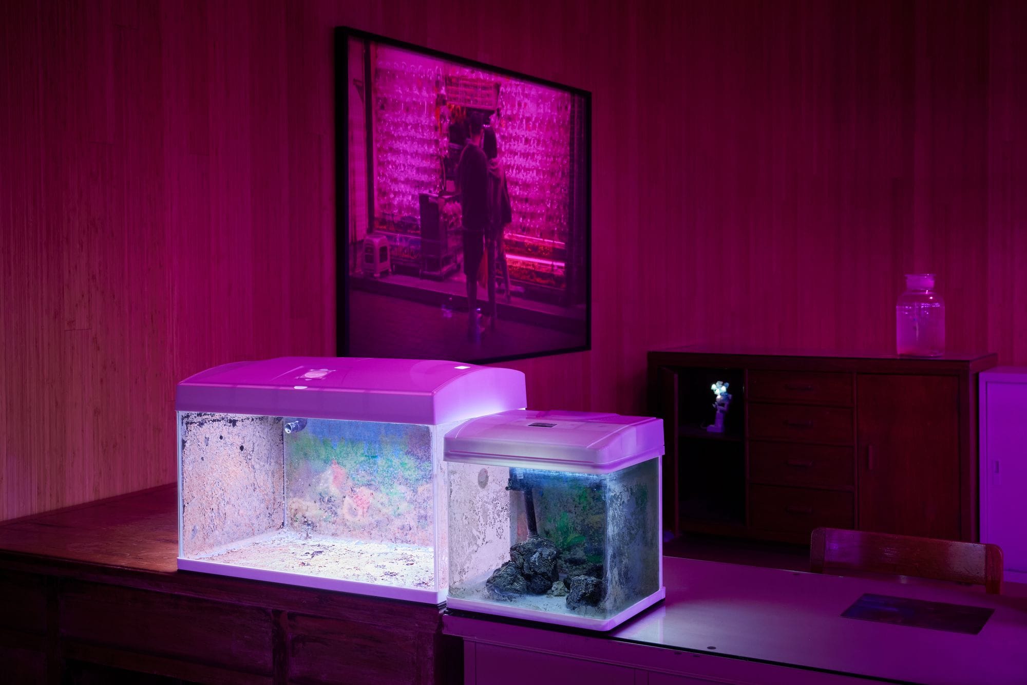 But can aquariums still be called “aquariums” when they no longer work? At the 2024 Venice Biennale, Yeung’s empty tanks were vibrant and lucent, furnished with algae that undulated under LED light. Last year, M+’s restaging of the Venice presentation, “Courtyard of Detachments,” was akin to a photographic negative: the containers were drained of water and their fronts were removed. In installations featuring multistoried racks of weathered, desiccated aquariums, we might feel as though we are studying a library of heartbreak, an archive of small implosions. Once sucked clean of water, the aquariums’ accoutrements of care—sponge filters, spawning brushes, ceramic platforms—gain an uncanny charge. Why are they still here? What are they waiting for?