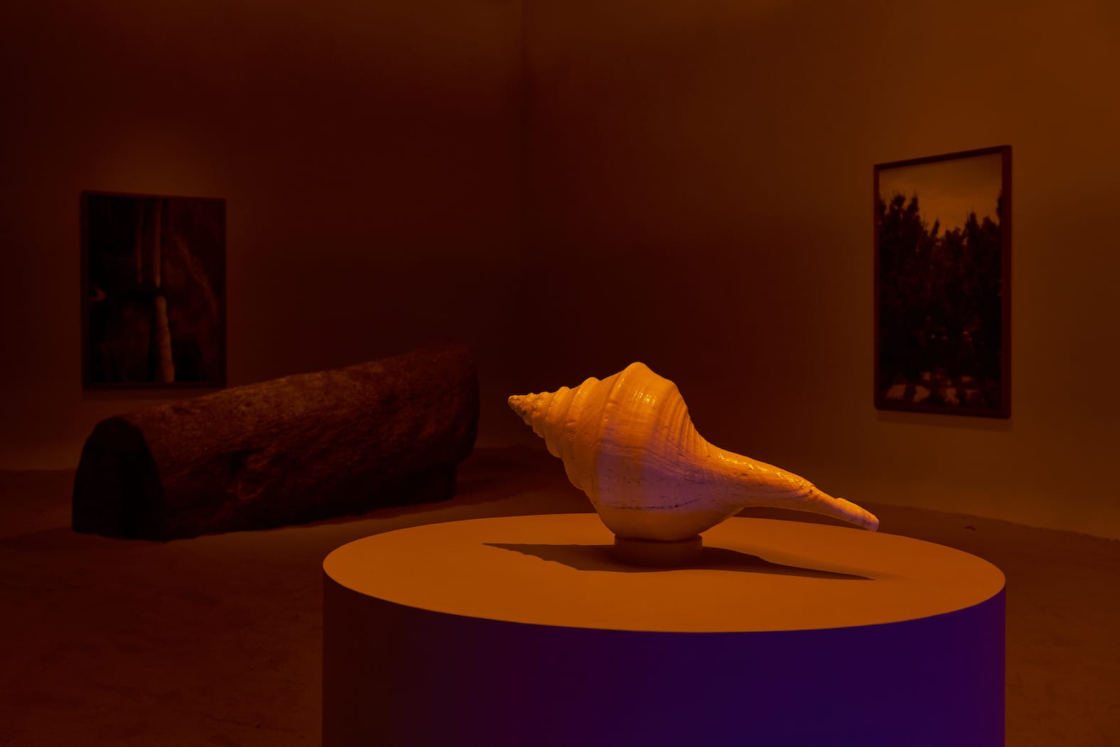 Some of Yeung’s most affecting gestures utilize forms of entropy to amplify the residual. In earlier presentations at Gasworks, Para Site, and Aranya Art Center, titled “Soft ground” (2023), “Soft breath” (2024), and “Soft conch” (2024–25) respectively, the artist recreated, through 3D scanning, a trunk from Hampstead Heath’s “fuck tree”—a site in London known for gay cruising since the 19th century. The trunk is cast in soap, which not only infuses the space with musk but also entails that the sculpture will melt and deform, bearing an affective correspondence to the poignant evanescence of queer eros. What moved me most was not the largesse of his arboreal replica, but the fugitivity of the soap secretions—tiny, pus-like blotches visible only if one bent low enough to the floor. By utilizing volatile material, Yeung renders his art as unstable objects that vary incrementally with every viewing, tracing parallel trajectories of disintegration and persistence. In Yeung’s site of loss, there is still the suggestion of change, and hence, life.