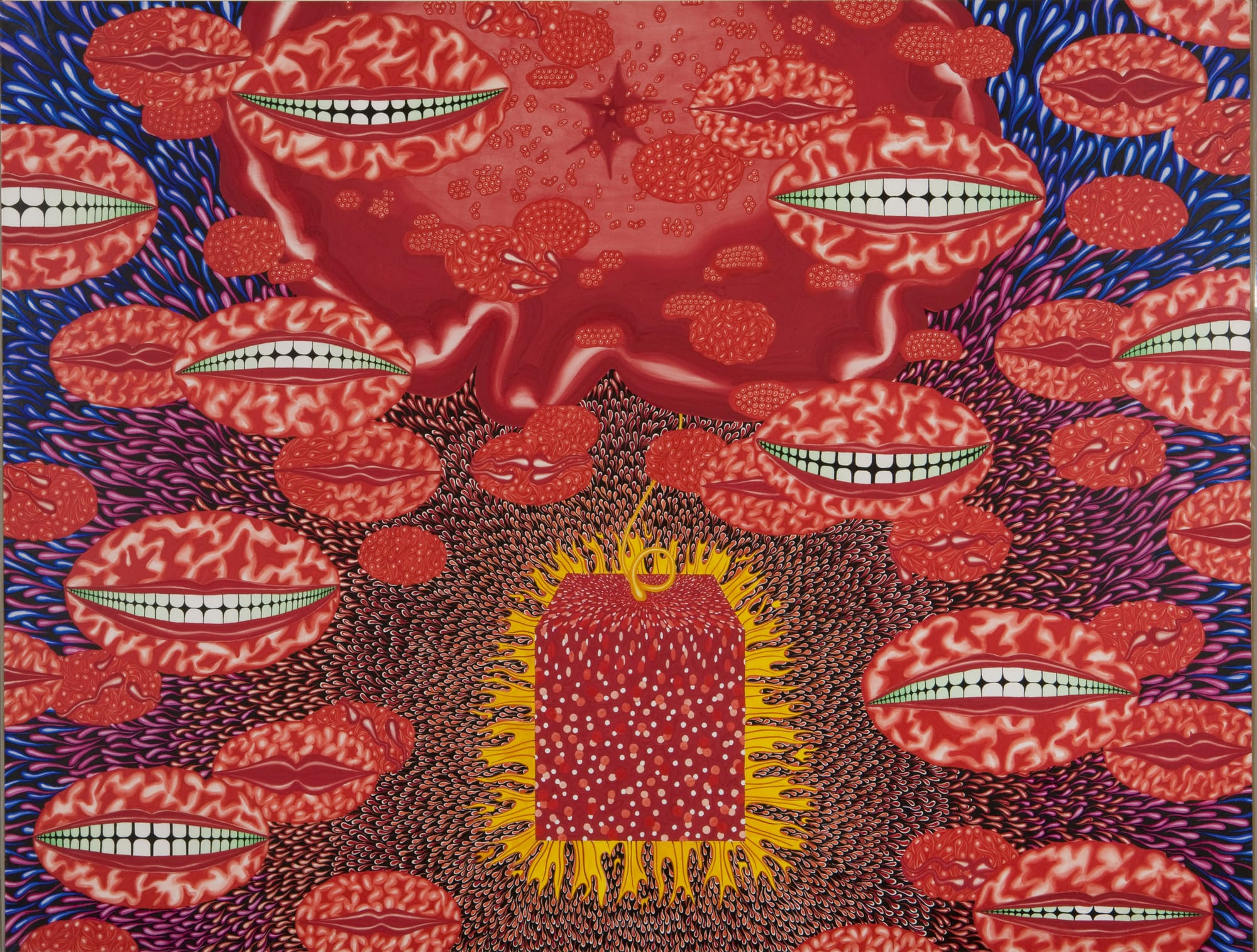 Angelhead, painted in 1968, presents a hypnotic field of biomorphic shapes and floating mouths that bare their teeth both seductively and menacingly. A cube patterned allover with dots anchors the central region of the painting, from which countless sperm-like shapes swim outward in radial multiplication, making the entire background pulsate with a sea of blues, purples, and reds. Dropped into this dislocating environment, one feels as if they, too, are a bundle of cells functioning within a larger, harmonious ecosystem. Angelhead’s graphic style demonstrates a strong aesthetic connection to Pop art, Op art, and other illustrative art forms that influenced psychedelic art. These otherworldly qualities return with enhanced narrativity and Taoist philosophy in Astral Theater (1973), which Cheng painted five years later.