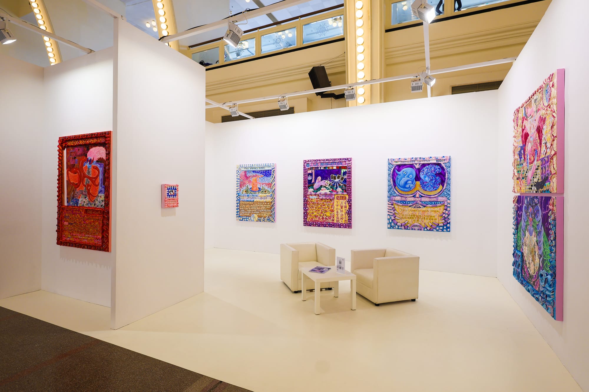 Across ART021, Gen Z artists were gaining visibility and commercial traction. BANK gallery presented a solo booth by Wenjue, an artist born in 2001, whose new body of work draws from childhood trading card battle games, incorporating visual languages from contemporary anime, religious altarpiece painting, and medieval illuminated manuscripts. These works explore the relationship between two-dimensional painting and three-dimensional relief through the physical buildup of paint and tactile surface treatment, resulting in images with both visual impact and symbolic depth.