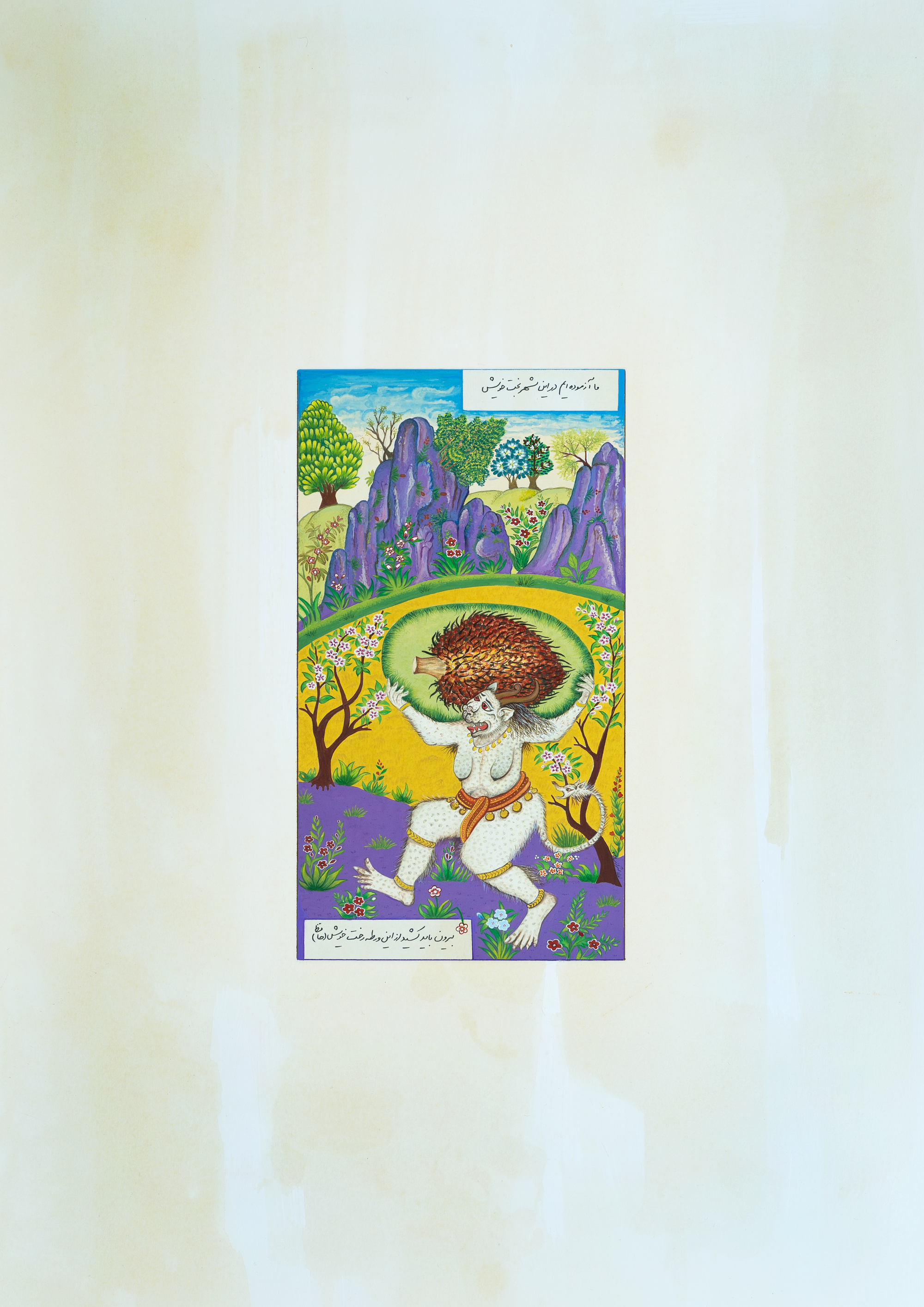 Shirazi’s experiences in Malaysia and her journeys northward through the Malay peninsula to Thailand exposed her to trucks carrying harvested oil palm fruits destined for processing into jet fuel, pharmaceuticals, and cooking oil. This monoculture causes significant ecological damage, as do logging trucks transporting rainforest timber south of the Thai border. In Untitled (حرکت جوهری ۲ // Substantial Motion II) (2021), Shirazi portrayed the “Div,” a horned demon-like creature in Persian mythology, set against an Edenic landscape and carrying a sack of oil palm fruits on its back. The figure appears ready to hurl the spiky mass back at humankind in retribution for its extensive environmental destruction.