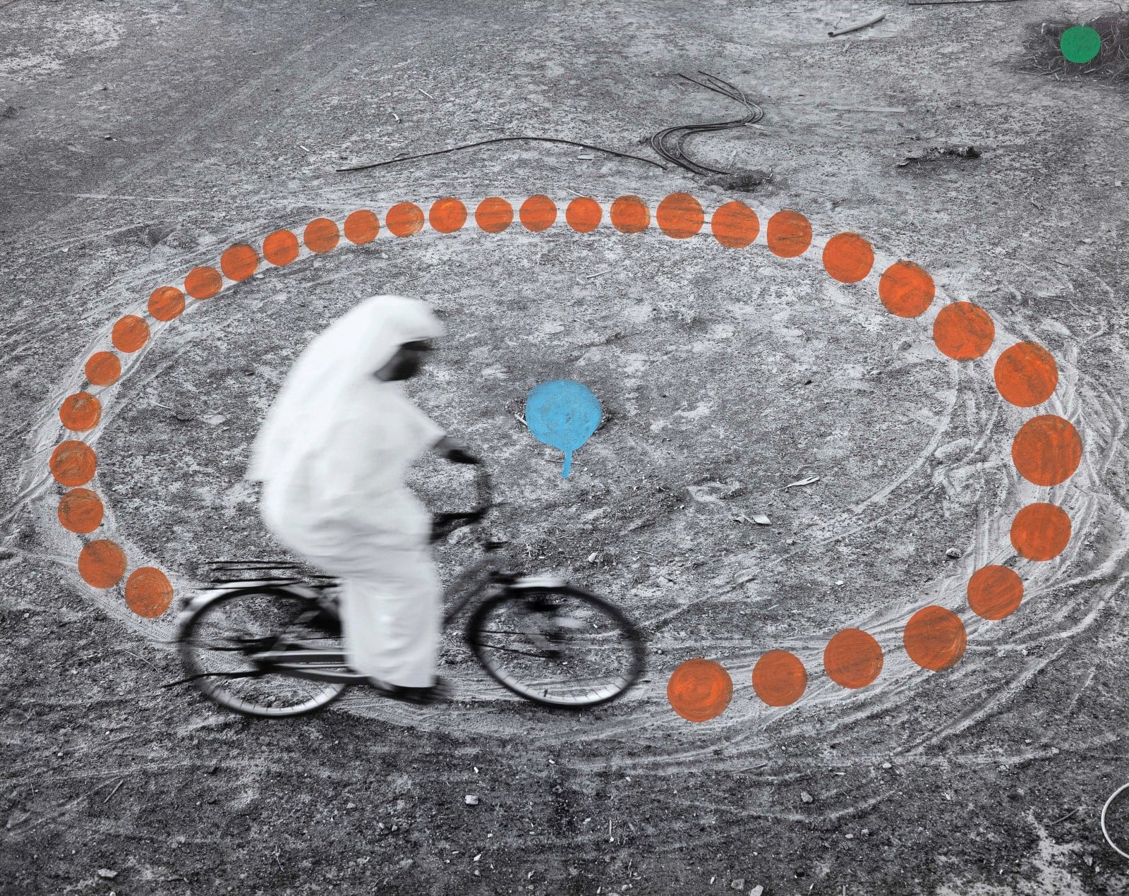“Ammar Al Attar: Silent Residues” is currently on display at Iris Projects, a gallery situated in the rapidly gentrifying district of Mina Zayed (MiZa), which is home to numerous port warehouses. Al Attar’s latest works feature photographs depicting everyday life in the desert near Sharjah, while the artist performed mundane activities such as riding a bicycle in circles or slouched over a pile of cement bags. These images are then overlaid with painted circles and vibrant annotations, highlighting the repetitive and ritualistic in both landscape and life.
