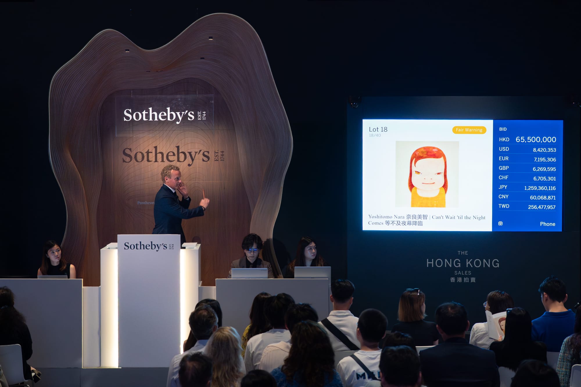 While there was no big-ticket Yoshitomo Nara lot at Christie’s on Friday, major paintings by the artist took center stage at Phillips and Sotheby’s on the following nights. At Phillips, Pinky (2000), a fresh-to-market portrait from a brief (and hence sought-after) early period in Nara’s oeuvre, was revealed as the house’s star lot at the end of July. Priced at HKD 60 to 80 million, it held the highest estimate for a work of this scale by the artist at auction. On September 27, in a room sparsely attended compared to Christie’s and Sotheby’s, there were no fireworks. Lisa Chow, managing director at Patti Wong & Associates, bid up the rare Nara to HKD 43 million in the room, and the work hammered at HKD 44 million (USD 5.7 million) to senior specialist Kevie Yang at the phone bank. In post-sale press releases and on the online lot page, the estimate was adjusted downwards—almost halved—to HKD 35 to 55 million.