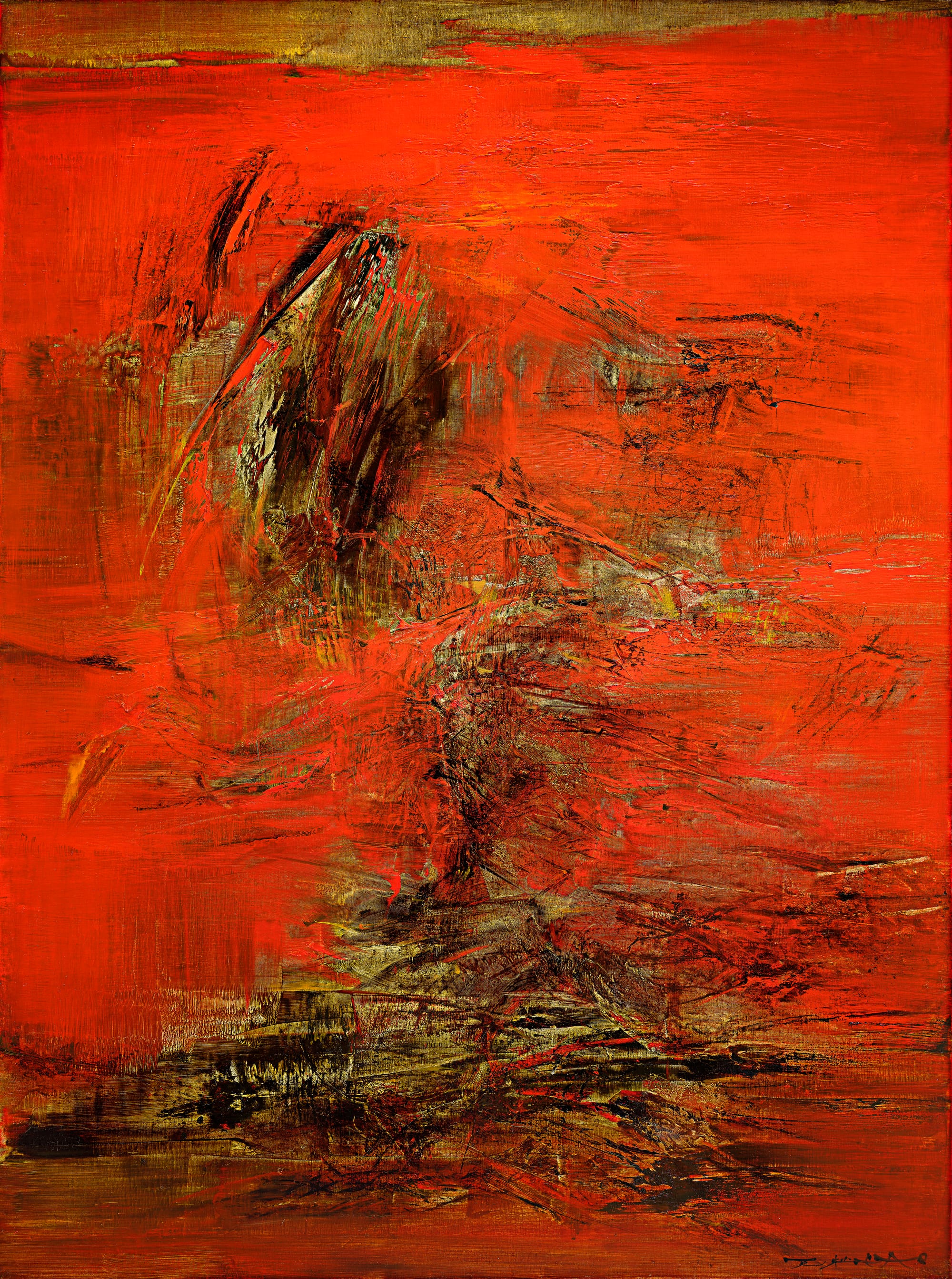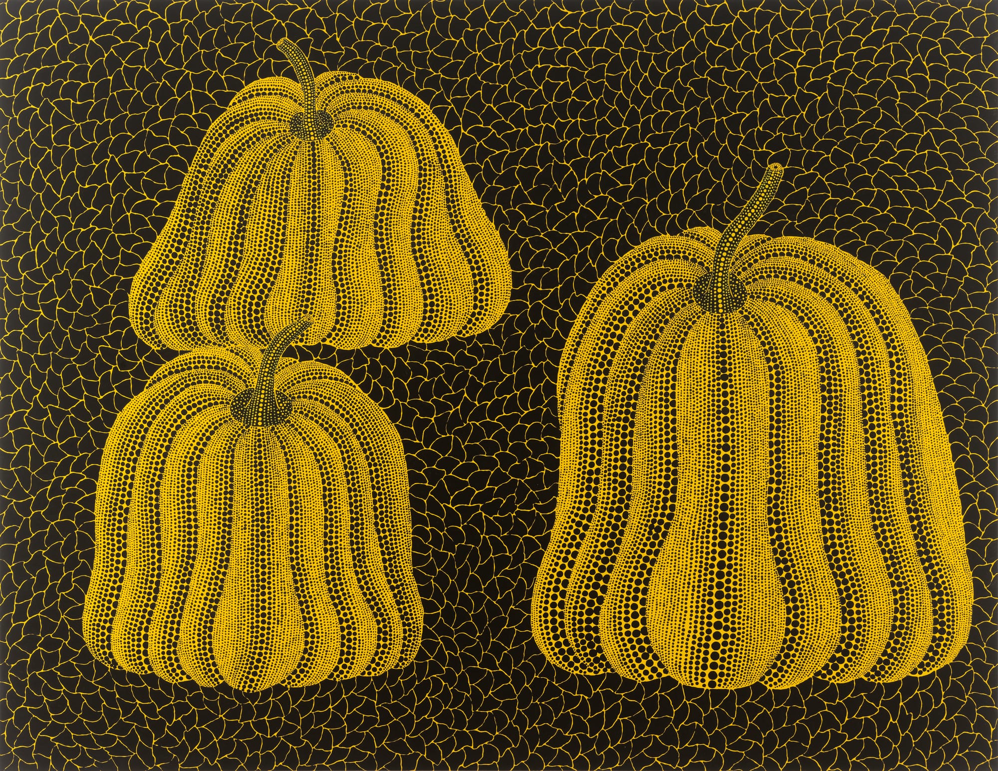 Left: ZAO WOU-KI’s 17.3.63, 1963, oil on canvas, 130 x 97.2 cm. Right: YAYOI KUSAMA’s PUMPKIN [TWAQN], 2015, acrylic on canvas, 112 x 145.5 cm. Courtesy Christie’s.