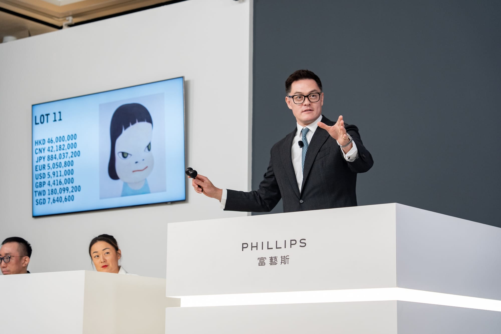 Phillips Asia chairman and auctioneer JONATHAN CROCKETT selling YOSHITOMO NARA’s Pinky in the saleroom on September 27, 2025. Courtesy Phillips.