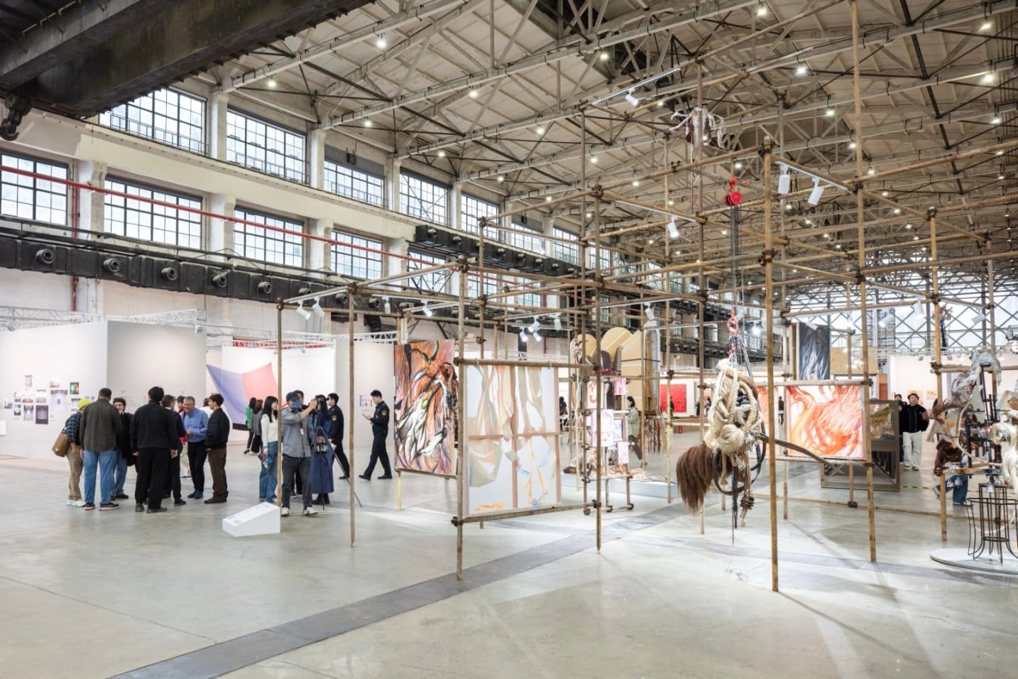 Meanwhile, the old West Bund Art Center was repurposed for “Xianchang,” a sector dedicated to large-scale installations and ambitious curatorial projects. Walking in, the first thing one noticed was ShanghART’s presentation of artist Hu Xiangcheng. The project consumed nearly a third of an entire floor, featuring paintings, sculptures, shipping containers, metal scaffolding, boom lifts, and more. The scale was industrial, almost architectural, utilizing the raw space in ways conventional booths would not accommodate.