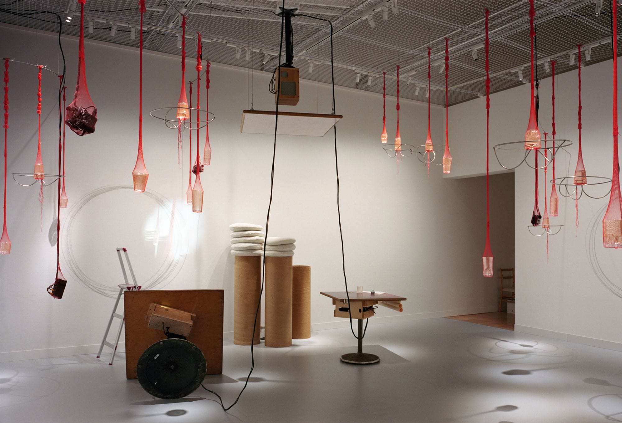 This was also the focus of 2023 Calder Prize winner Aki Sasamoto’s midcareer survey, “Life Laboratory,” at the Museum of Contemporary Art Tokyo. Born in 1980 in Kanagawa, Japan, Sasamoto studied and continues to work in New York, utilizing multiple mediums to express her ideas. In the site-specific performance, Spirits Cubed (2020), Sasamoto appeared in a large room with its walls painted black and with materials left behind after a building renovation, deliberately installed in a whimsical fashion. Originally a site-specific intervention for Japan’s Hirosaki Museum of Contemporary Art, the Tokyo edition featured glass windowpanes, ladders, trolleys, and metallic air-conditioning ducts hanging from the ceiling and sprawling across the ground. These channeled wind into glass orbs containing drinking glasses, causing them to spin in a centrifugal fashion. Sasamoto herself drew weather notations onto a plexiglass panel—from wind barbs, isobars, and other symbols from a synoptic chart—while she intermittently sprinted across the room and into the audience. She created sound by forcefully pulling a large plastic bag overhead and trapping air, and whipping the air-conditioning ducts, dragging them across the floor. Sasamoto sees these objects as forming pathways for spirits, perhaps propelled by the wind and other natural, kinetic forces.
