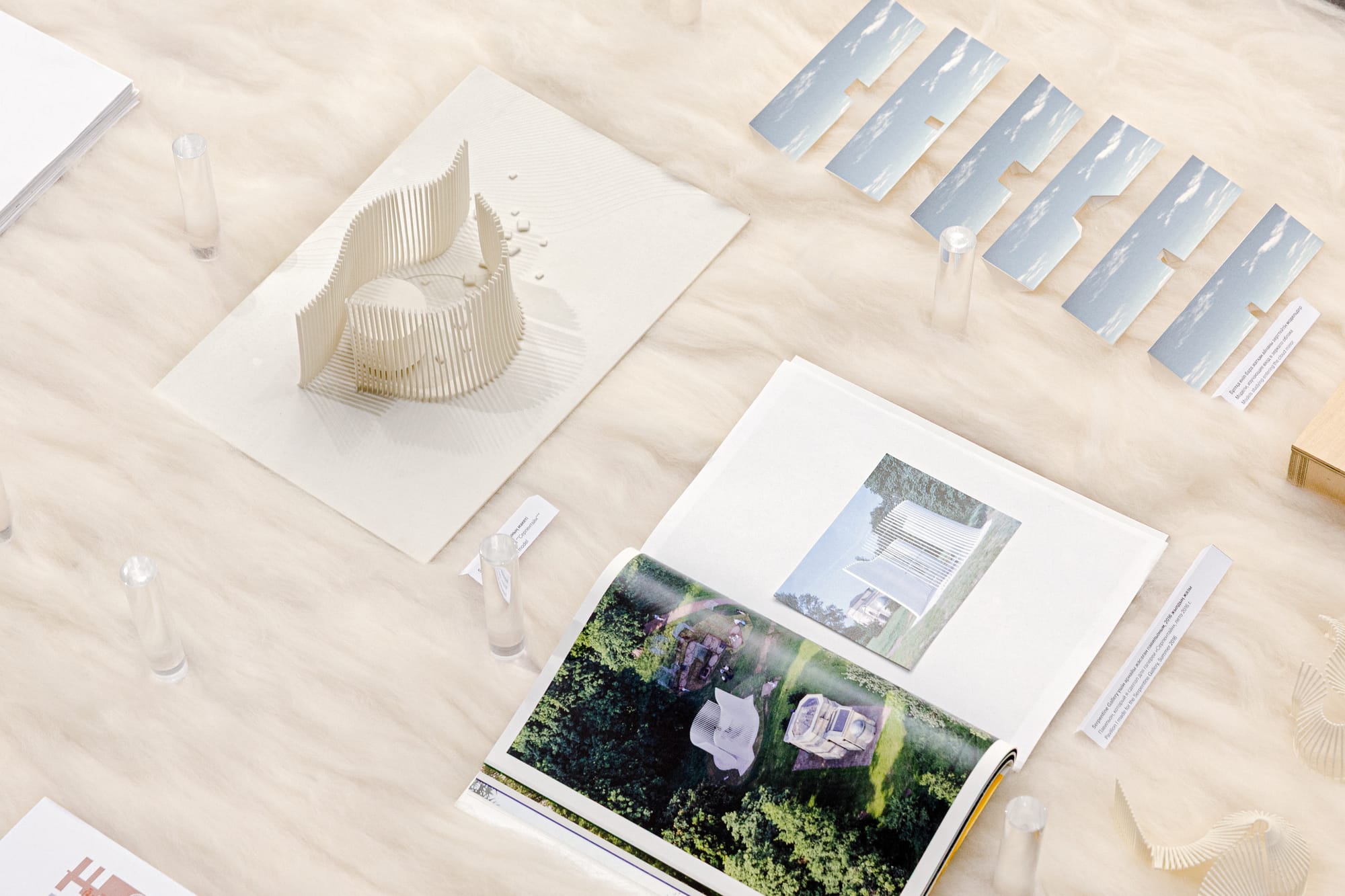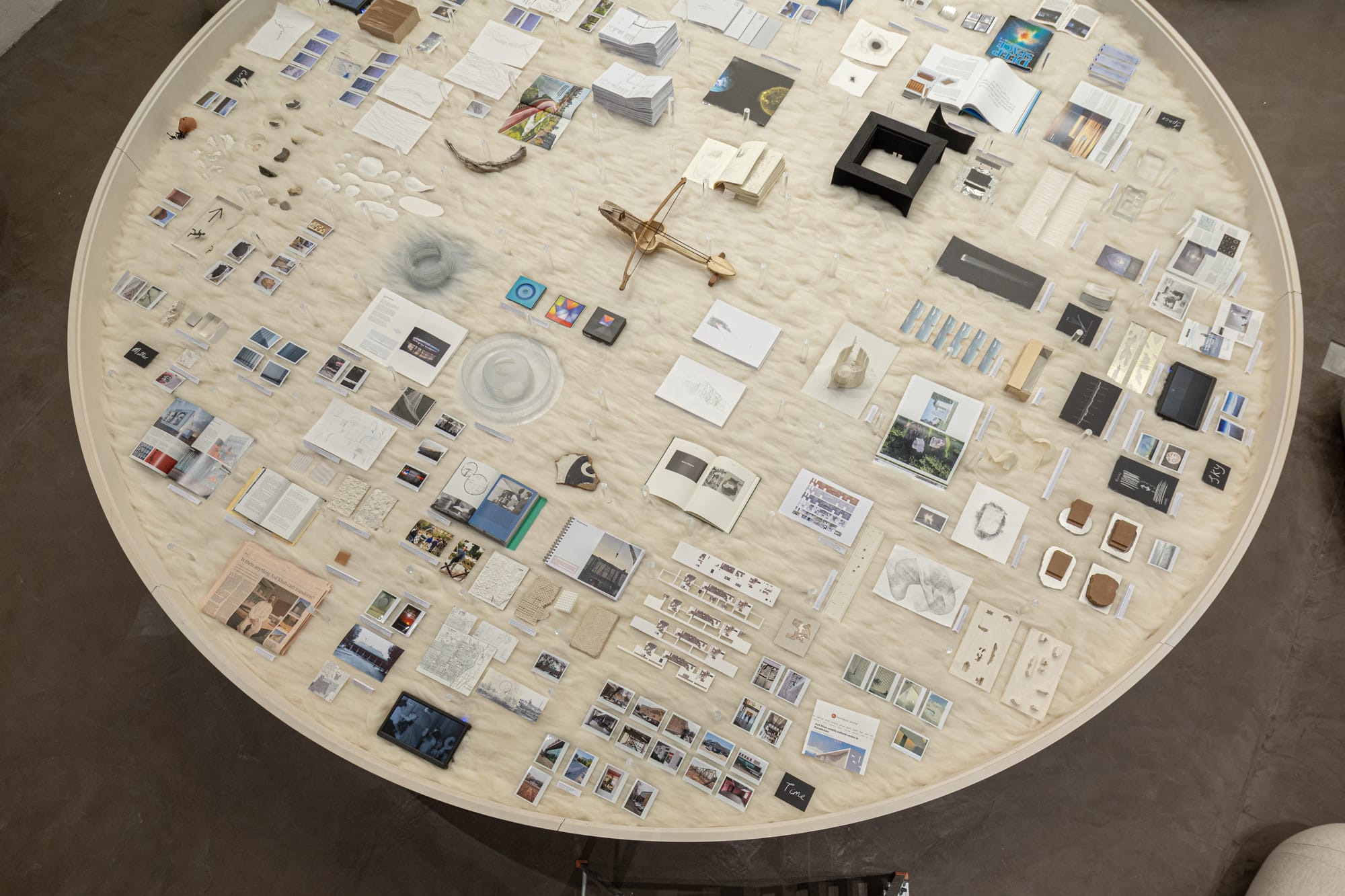 As part of the exhibition “From Sky to Earth,” curated by the Finnish architectural historian Markus Lähteenmäki, this is a series of dioramas made by a local craftsman, which we’ve named “Lesser Known Scenes from the Recent Life of Tselinny.” They show how extensive the reconstruction has been. Nearby, a larger model describes the completed building, and a study corner gathers drawings, photographs, and working materials from the studio. The five-meter-diameter circular table at the center is filled with models and photographs I’ve taken over the past eight years—through this journey with Zaure and with Tselinny—tracing significant moments of research, imagination, and experimentation. It’s a glimpse into how the project has evolved over the years, and what has influenced it. It’s like a mind map.