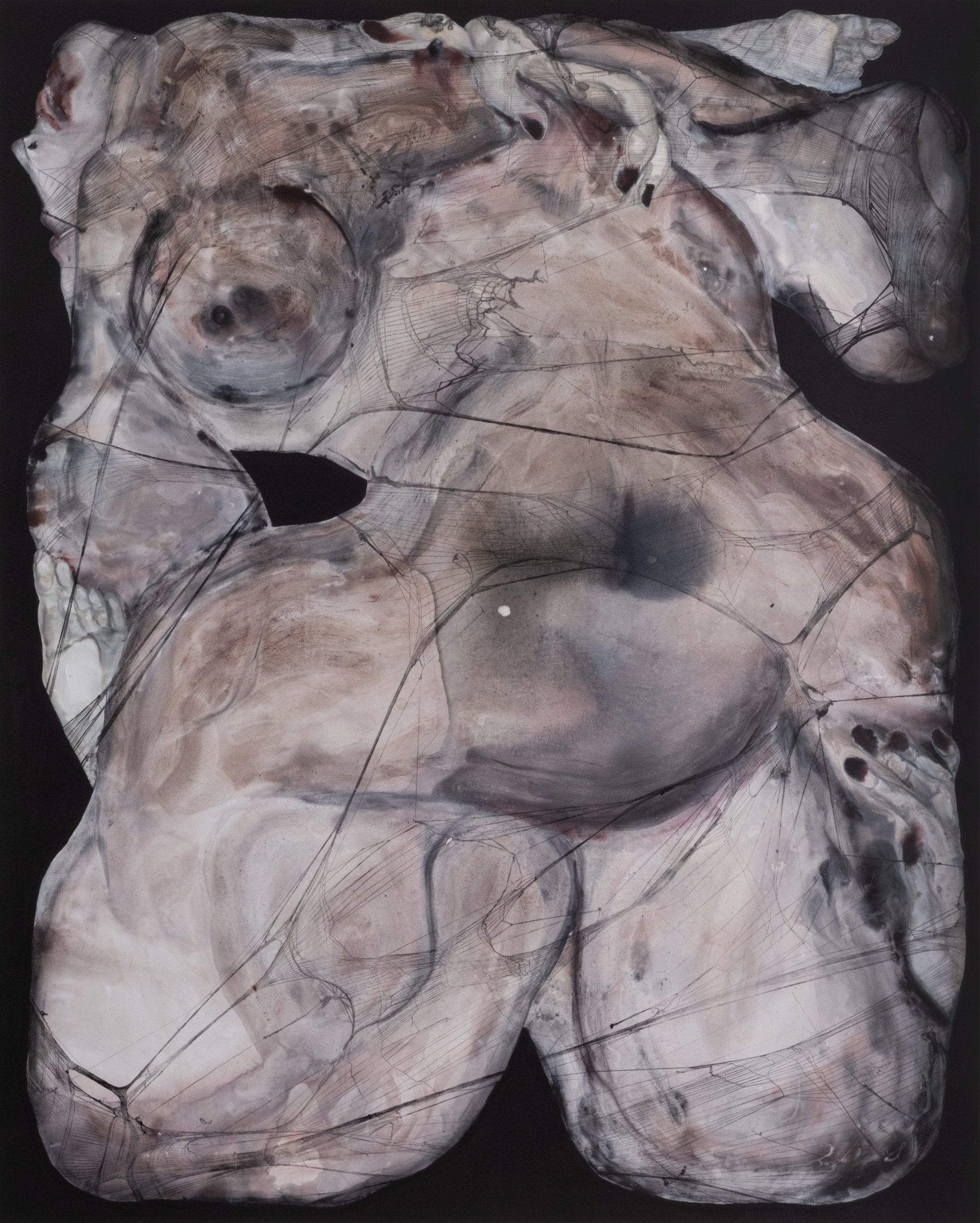 The process enacts violence three-fold: first, through Zhang’s own forceful manipulation of the nylon; second, through the literal and symbolic aggression the nylon exerts as it compresses the wood boards and painted forms; and third, through the transferal of a crime—where, by a deft sleight of hand, the artist shifts culpability for the torn hosiery onto the painted physiques themselves, suggesting it was their very mass and corporeality that stretched and split the mesh. Never once encasing actual bodies, the stockings drape over the wood boards as husks—specimens preserving the remnants of struggle. Their imprints on canvas are vestiges twice removed—spectral traces of mere echoes of violence—and yet they retain palpable tension, engendering intriguing dialogues between surface and substrate, skin and flesh, exposure and concealment, form and void.
