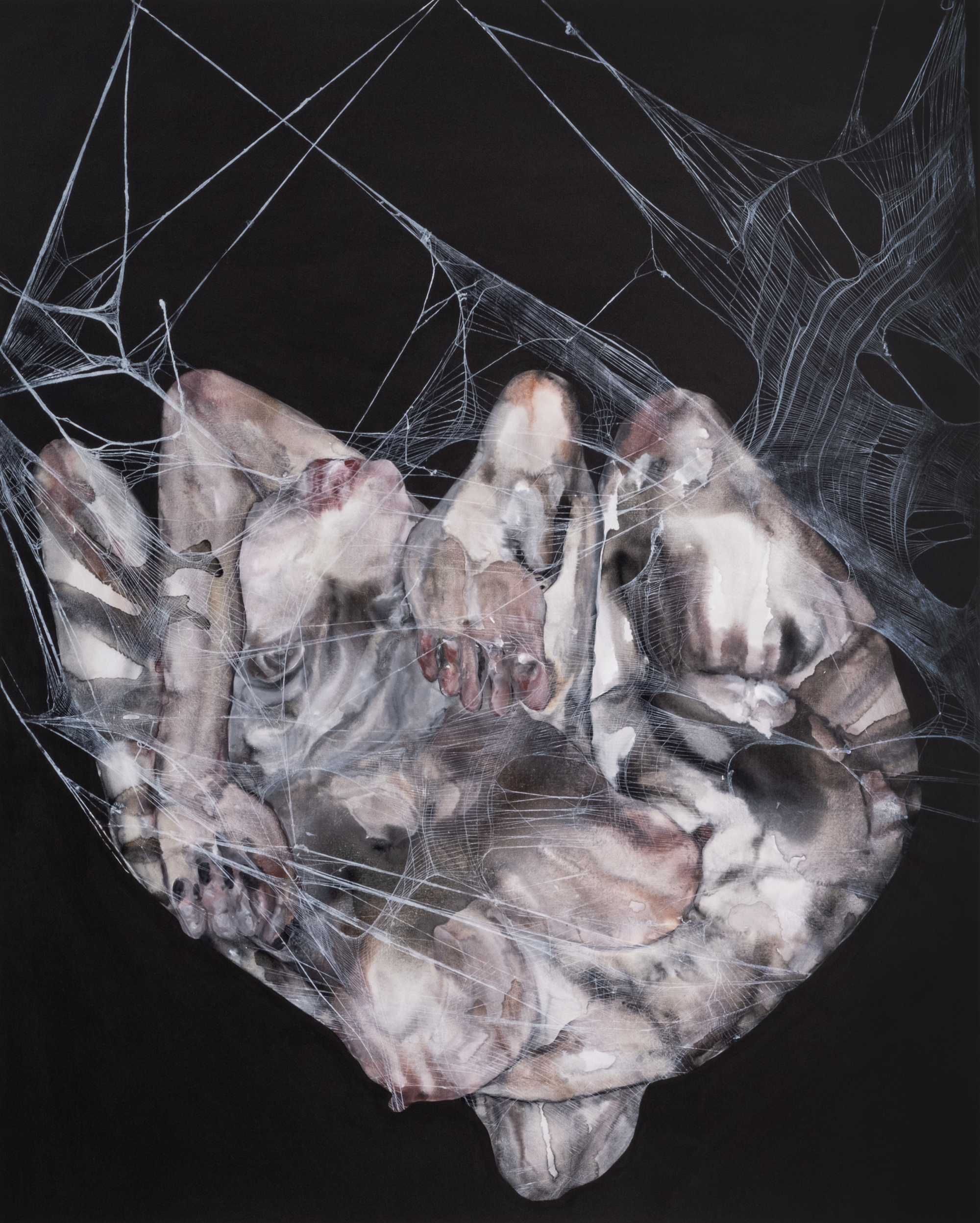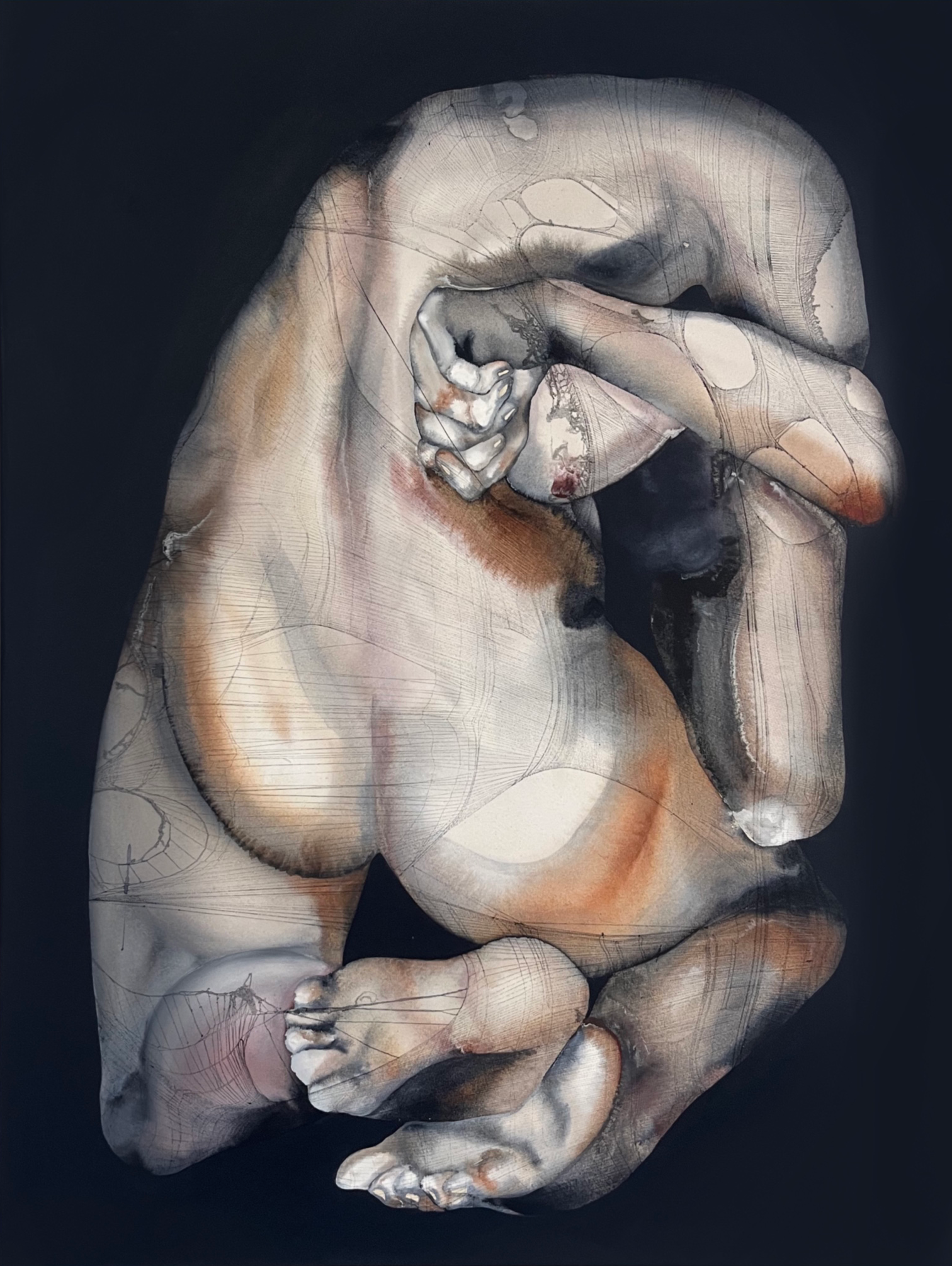 What more still can be done with—or to—the body in art? 27-year-old Chinese artist Zhang Mingxuan seems to want it born again. In 2023, her debut solo show at Hive Center for Contemporary Art in Shanghai featured paintings of gnarly human forms rendered in translucent ecru and mauve—bruised yet diaphanous, as if glistening with amniotic fluid. In two watercolor-on-silk works, a pellucid membrane clings to estranged, entangled limbs, evoking spider silk or an unraveling cocoon. The exhibition, held the year she graduated from her MA in printmaking at the Royal College of Art in London, also showed examples of what would become her first mature sequence of works: bodies, enmeshed in torn hosiery, smothered and compressed—many contorting into fetal positions, ready to retreat into a womb.