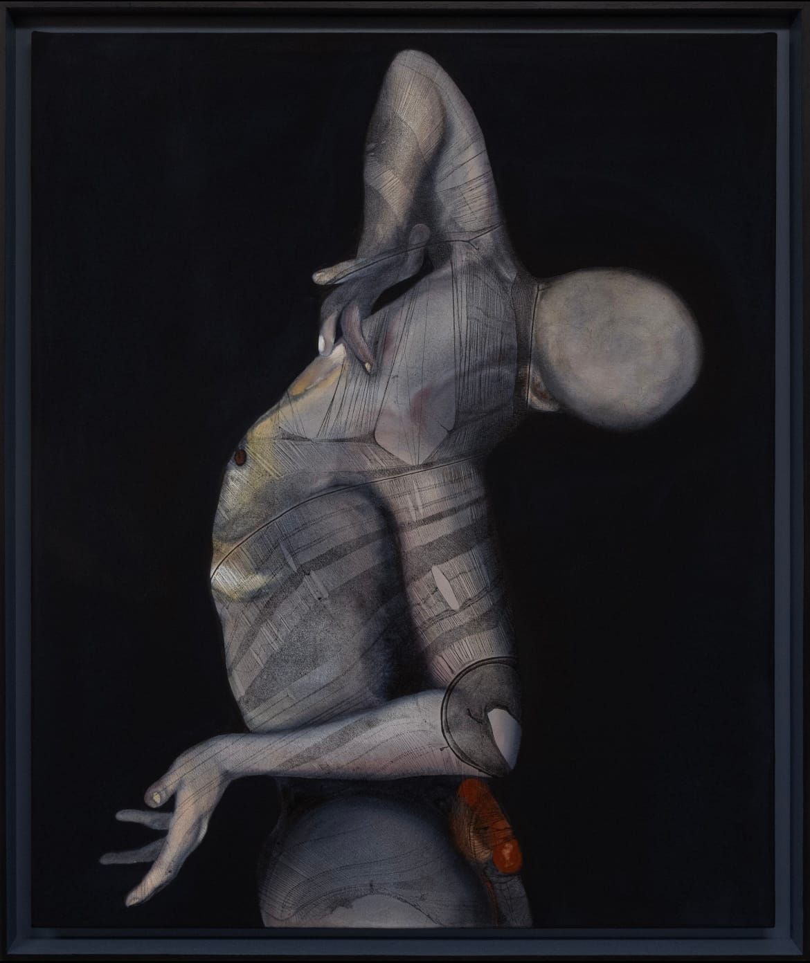 For Zhang, who once walked through Richmond Park in a stocking suit, allowing branches to snag her fragile garment, performance—specifically its embodied experience—is foundational to her practice. Her figures on canvas are less objects or subjects of representation than conduits of visceral intensities: neither sexualized nor idealized, their abject, deliberately distorted bodies articulate their own unspeakable truths. Acquiring agency through the restrictive confines of their “second skin,” Zhang’s writhing forms exude a sacred stillness and monumentality, even in their most grotesque poses. Recent works witness bodies unfolding from their embryonic state—stretching, somersaulting, or arching to scratch an itch—signaling a kind of awakening. This development intertwines with explorations of familial and ancestral networks where hesitant souls navigate between tenderness and alienation, offering meditations on identity, trauma, and resilience.