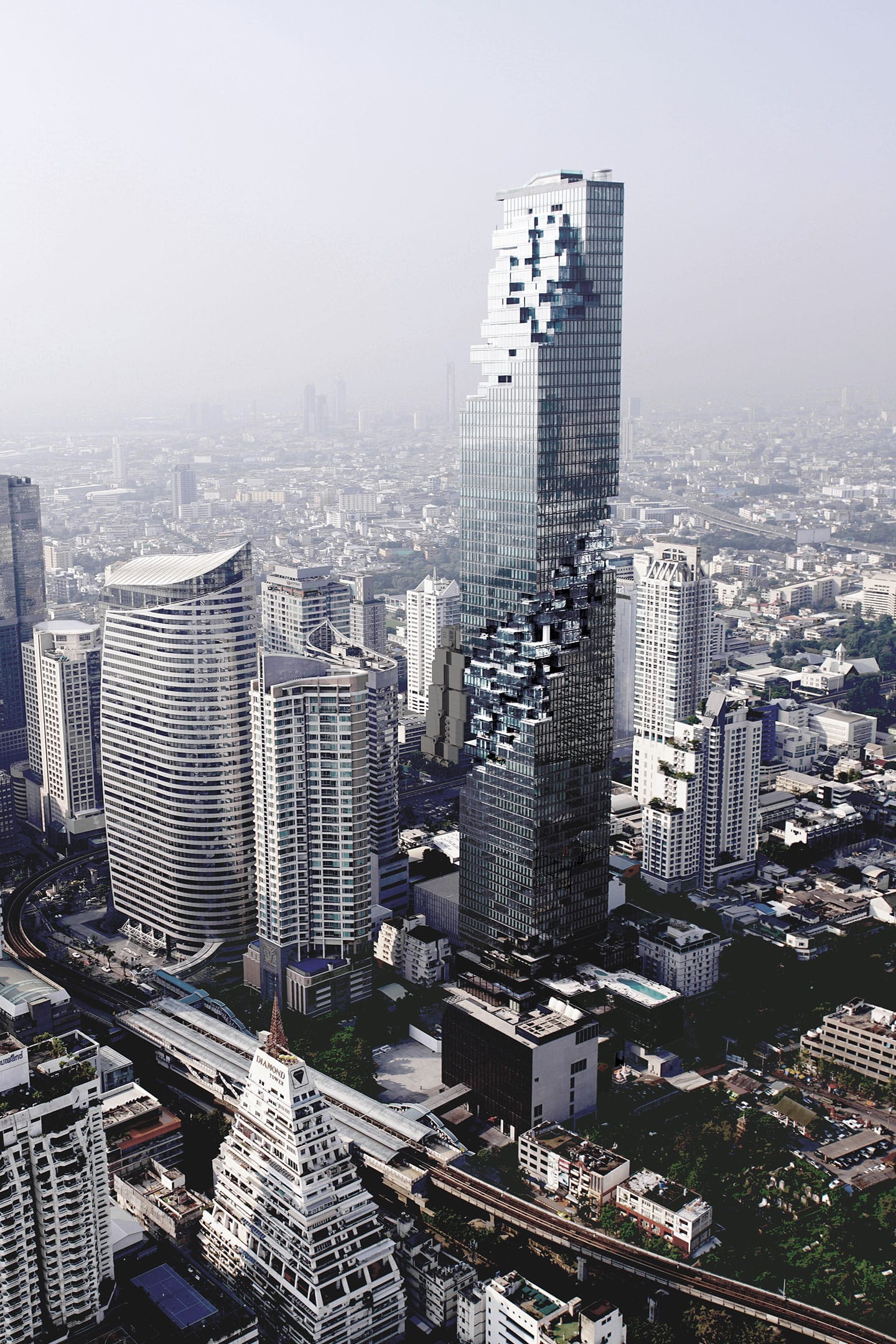 View of CCTV by REM KOOLHAAS and OLE SCHEEREN in Beijing. Copyright and courtesy OMA and Büro Ole Scheeren (left); and view of MahaNakhon by Büro Ole Scheeren in Bangkok. Photo by Wison Tungthunya. Copyright and courtesy Büro Ole Scheeren (right).