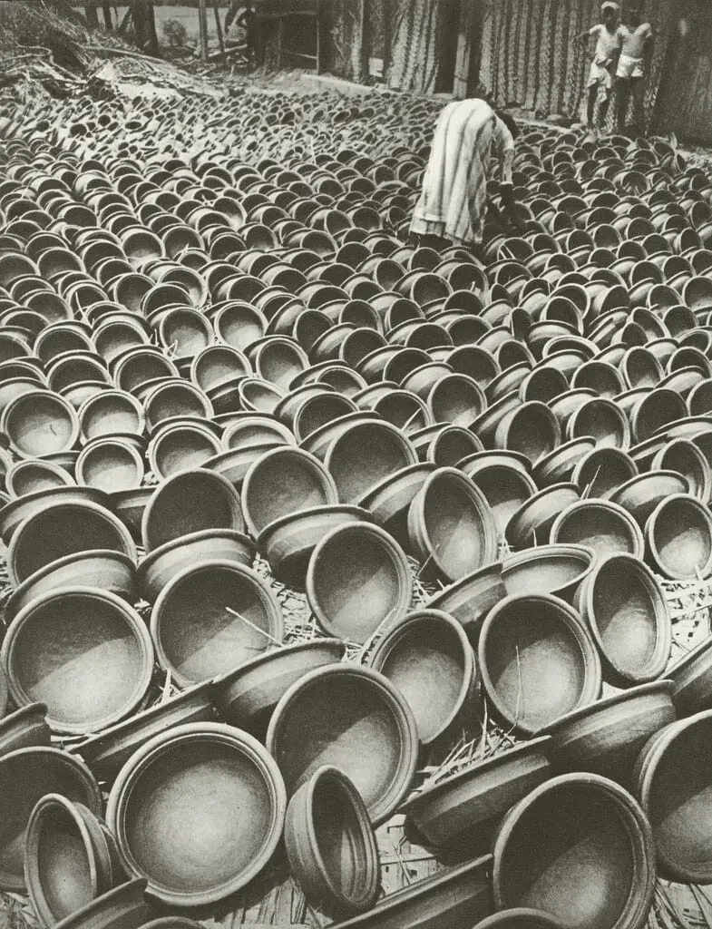 At the Pottery (c.1937) is an example of Wendt’s more straightforward, documentary-style work. His early adoption of the more compact and portable Leica rangefinder gave him the freedom to move outside the studio and shoot scenes from across the island. His series focusing on Ceylon’s rural industry is the highlight of this collection. At the Pottery demonstrates Wendt’s modernist approach to composition, using cropping, lighting, and perspective to show commonplace objects—in this case, bowls—from an unusual vantage point. The photograph brings to mind the work of his North American counterparts and their images of industrialized mass production, while remaining unequivocally grounded in the localized context of his homeland. Take Margaret Bourke-White’s photograph Delman Shoes (1933), which bears a striking likeness to At the Pottery, but zeroes in on shoes instead of bowls. However, while Bourke-White’s picture emphasizes the issue of overproduction and underconsumption in the US during the Great Depression, Wendt’s image is a celebration of abundance. Handcrafted and locally made, the bowls are in diametric opposition to machine manufacturing. The photograph adds to the premise of Ceylon’s self-sufficiency and industriousness, while also underlining the country’s natural abundance: running themes in his work that aimed to bolster Ceylon’s movement toward independence.