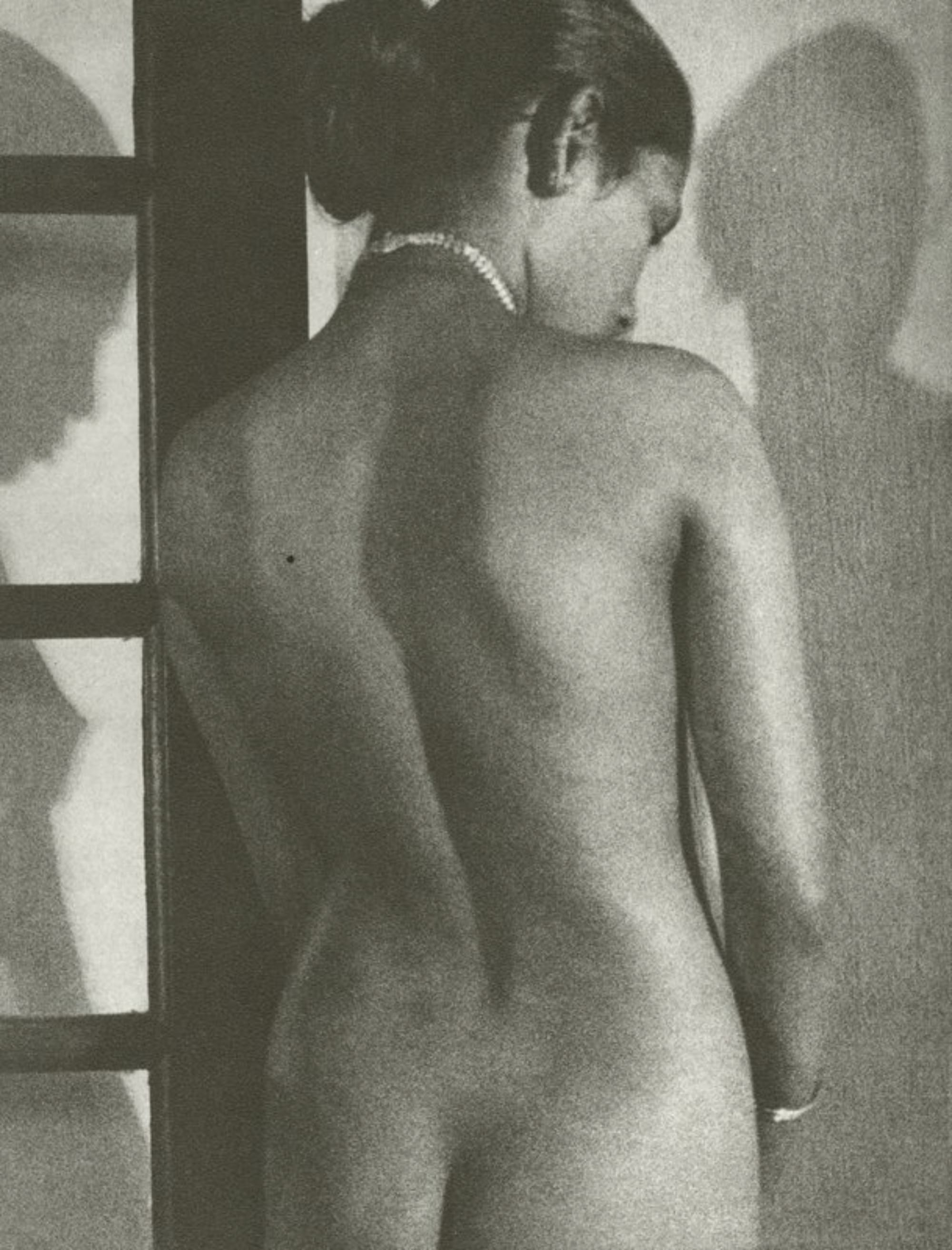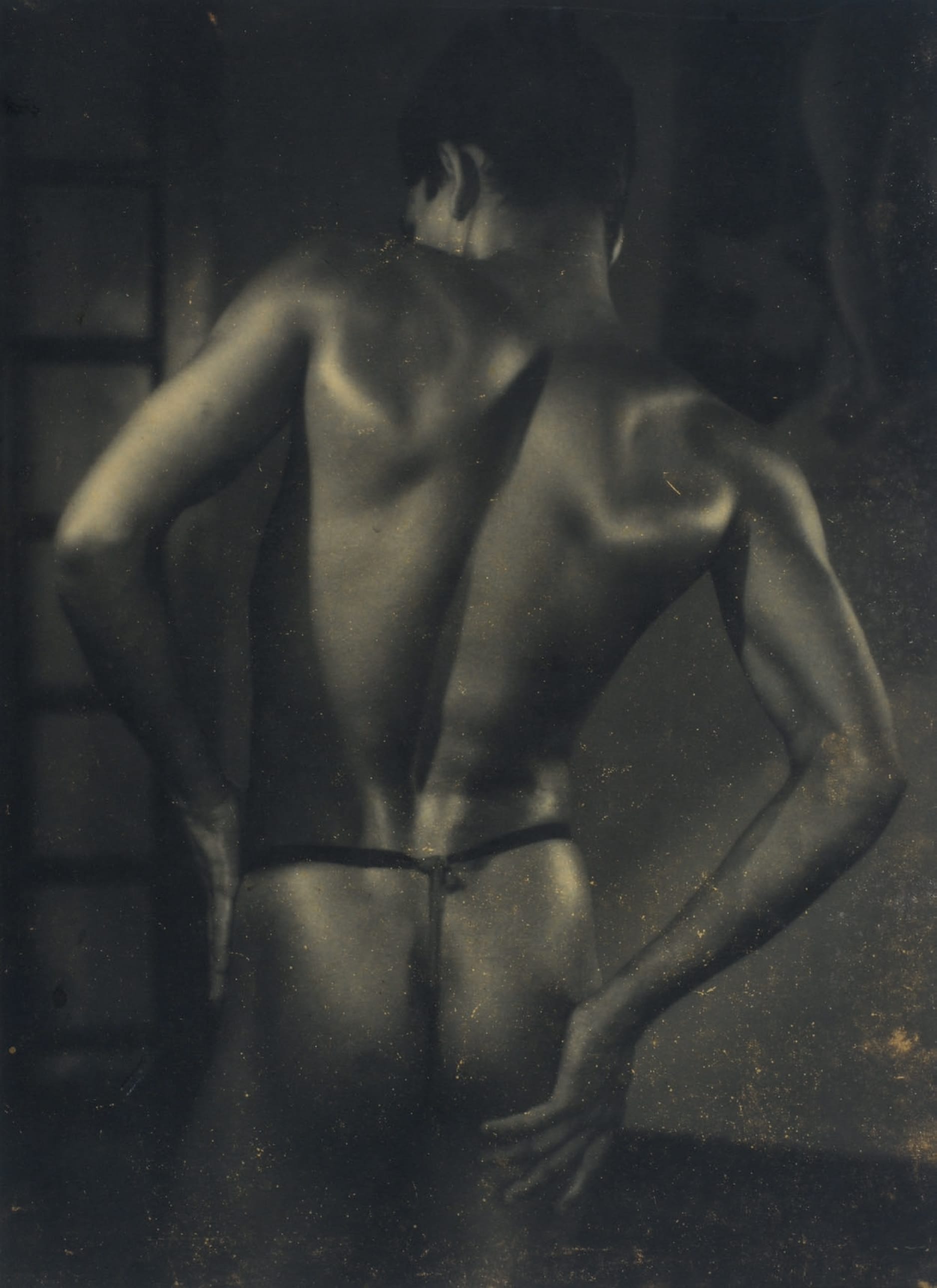 A perfect counter to Wendt’s erotically charged male studies can be found in his female nudes, which are rendered very differently. Gone are the dark contours and glistening bodies—instead, these images are marked by a very delicate, sensitive touch. Compositionally, Nude (c.1932–44) is similar to Back of a Youth, with its tight crop and pose of the subject, whose back is turned to the viewer, her head lowered and face hidden. In Nude, however, the woman’s posture is much more relaxed. The contrast between light and dark continues to play an important role here, but the focus lies on the cast shadows, rather than the chiaroscuro. Most evocative is the shadow to the left, which lays bare the subject’s profile and the graceful curve of a breast, divided by the panels of a sliding screen door. This composition is balanced symmetrically by a second shadow to the right. The soft, slightly grainy quality of the print comes from Wendt’s use of the bromoil process: a darkroom technique that was popular among pictorialists for its unique texture and tonality.