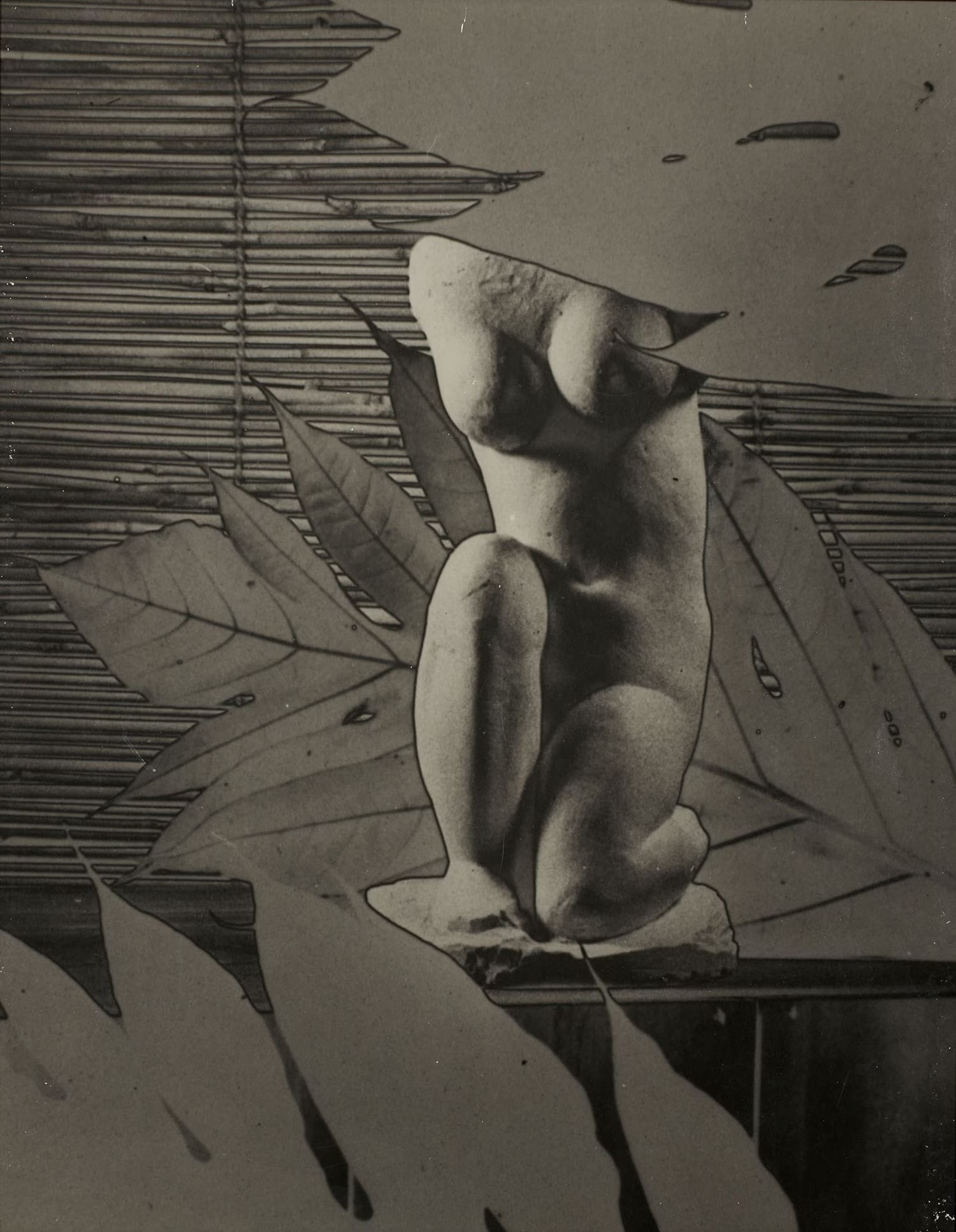 Further underscoring Wendt’s prowess in the darkroom are his series of more experimental works, for which he employed various techniques: photomontage, reversal, solarization, and even the photogram. What makes Still Life on Balcony / Statuette Among Leaves (c.1934–38) stand out is Wendt’s combined application of multiple techniques on a single print. This photograph debuted in Leica News and Technique No. 32, 1938, in an article titled “‘Solarisation,’ or Partial Reversal,” which was also the first published instruction on the process. In this issue, Wendt notes how his initial interest in solarization was sparked by the work of Man Ray, who first developed the technique alongside Lee Miller, his assistant at the time. Through much experimentation, Wendt devised his own approach. Leica also sponsored Wendt’s first solo show, an “Exhibition of Leica Photographs by Lionel Wendt, Ceylon,” held in London that same year. The statuette appears to be a South Asian Buddhist relief carving, similar to those documented by Wendt in his photographs of Ceylonese religious sites, providing an intriguing parallel to his nude photography.