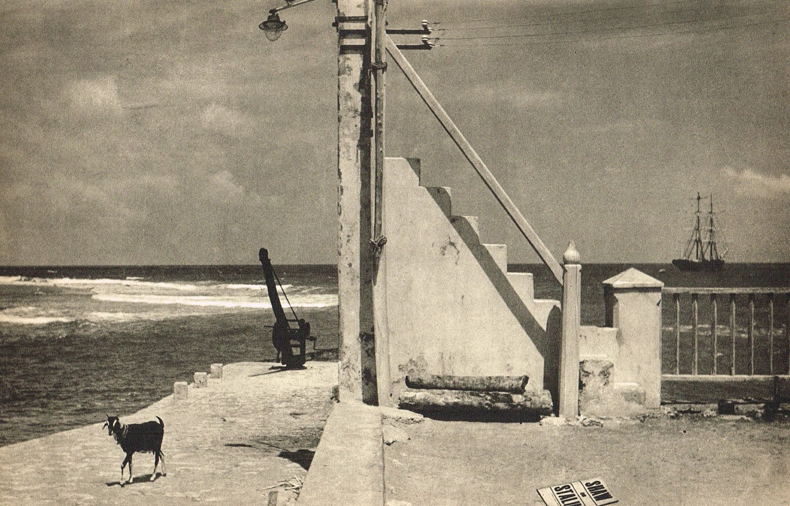 This seemingly ordinary sea and landscape photomontage is peculiar for a number of reasons. Firstly, it differs considerably from Wendt’s more prosaic beach scenes and other landscape works. The structured composition, as well as the strange juxtaposition of disparate objects, give the photograph a surreal quality. The frame is neatly divided into four equal quarters—divided lengthwise by the horizon and, vertically, by a rather forlorn telegraph station. In the top right quadrant sits an 18th-century brig, presumably anchored, sails furled. The pier is similarly lifeless, save for an oddly out-of-place goat toward the bottom left. The scene carries an air of abandonment, perhaps signifying a vanishing age of colonialism, tinged with an introspective melancholy—Wendt’s lineage, after all, made him a direct descendant of these settlers. On the very bottom right, however, lies a booklet titled Shaw on Stalin: a 1941 publication by George Bernard Shaw, controversially extolling the virtues of Stalin’s Soviet Union. Wendt was a vocal advocate of socialism, no doubt suggesting a way forward for his country.