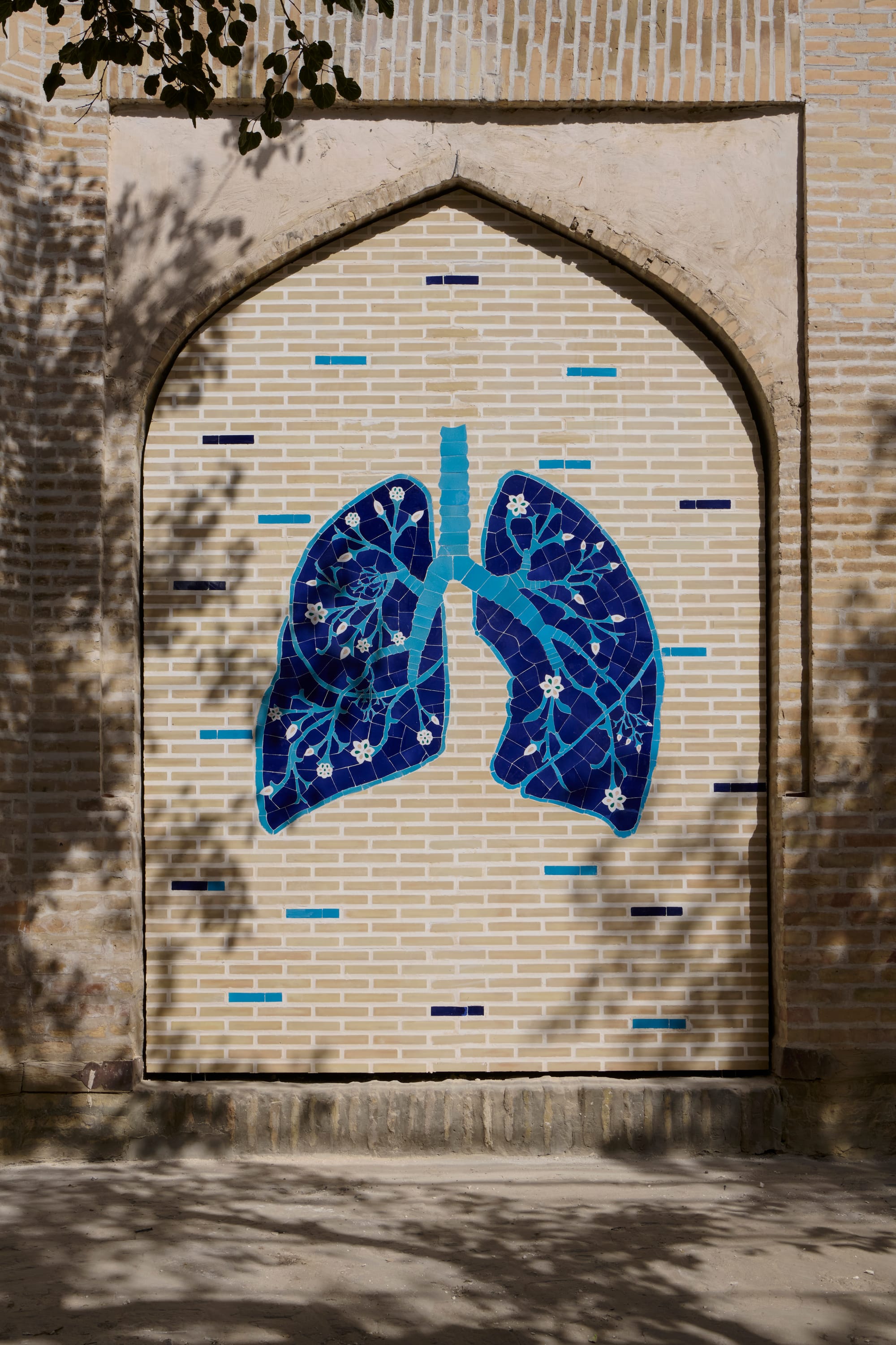 The lungs were installed in the Gavkushon Madrasa because the space itself already “breathes.” Four old mulberry trees grow there, almost extending the work of the lungs by giving shade, coolness, and most importantly, oxygen. They make the courtyard feel alive and pulsing.