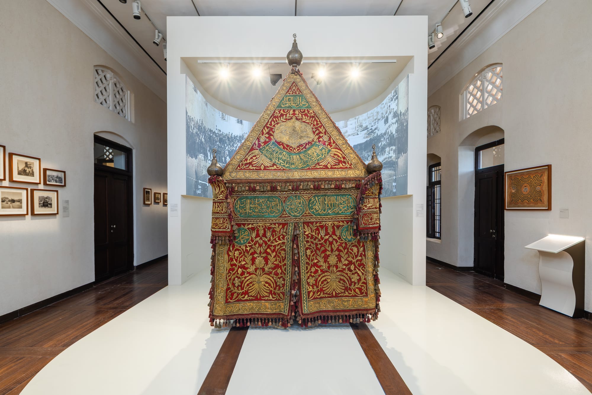 One of the earliest moving images of Mecca and the Hajj are presented in the form of Dutch filmmaker George Krugers’s historic Het Groote Mekka-Feest (The Great Mecca Feast) (1928), a mesmerizing visual diary of a group of Muslims from Bandung, in the Dutch East Indies, undertaking their pilgrimage to Mecca via a shipborne voyage to Jeddah. Another film by the Frenchmen Marcel Ichac and Raymond Ruffin, Mecca and the Hajj (1948), traces Moroccan pilgrims’ passage from North Africa to Mecca. There is also a small selection of photographs by Christiaan Snouck Hurgronje, the renowned Dutch scholar, government advisor, and alleged spy. Regretfully, there is no historical contextualization about the conditions of colonial power within which these works were produced, the othering biases of Orientalist perspectives, or these documentarians’ controversial histories: Krugers and Hurgronje likely posed as Muslims to enter Mecca, and the latter eventually admitted he had appropriated photographs taken by his friend Abd al Ghaffar, presenting them under his own name. Other Hajj memorabilia on view include antique maps showing caravan routes; Hajj passports and diaries; Saudi banknotes specially issued for pilgrims’ and an elaborate 19th-century Egyptian mahmal covering, a ceremonial palanquin that Egyptian rulers dispatched annually to Mecca.