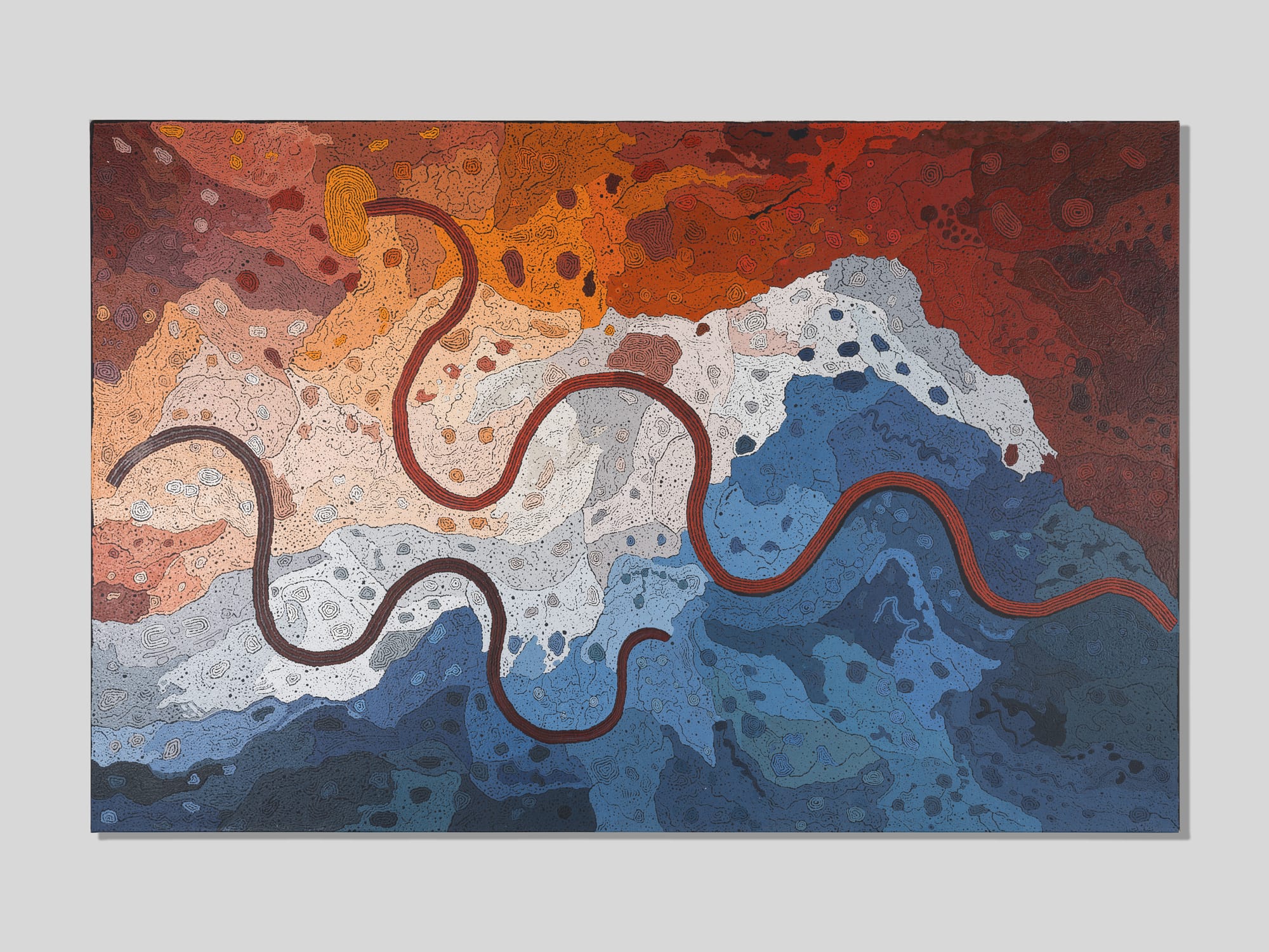 A Pitjantjatjara artist from the Aṉangu Pitjantjatjara Yankunytjatjara Lands in the far north of South Australia, Keith Stevens opened the exhibition with Pilati (2007), a work that that moved beyond pictorial representation to engage the materiality of the land itself, animating the innate beauty of stone as it rests in the heart of his birthplace. His painting of synthetic polymer on linen conveys the rough terrain in its naturalistically pockmarked, tectonic shapes and mineral hues, while serpent-like lines traverse the canvas as an assertion of ancestral territory.