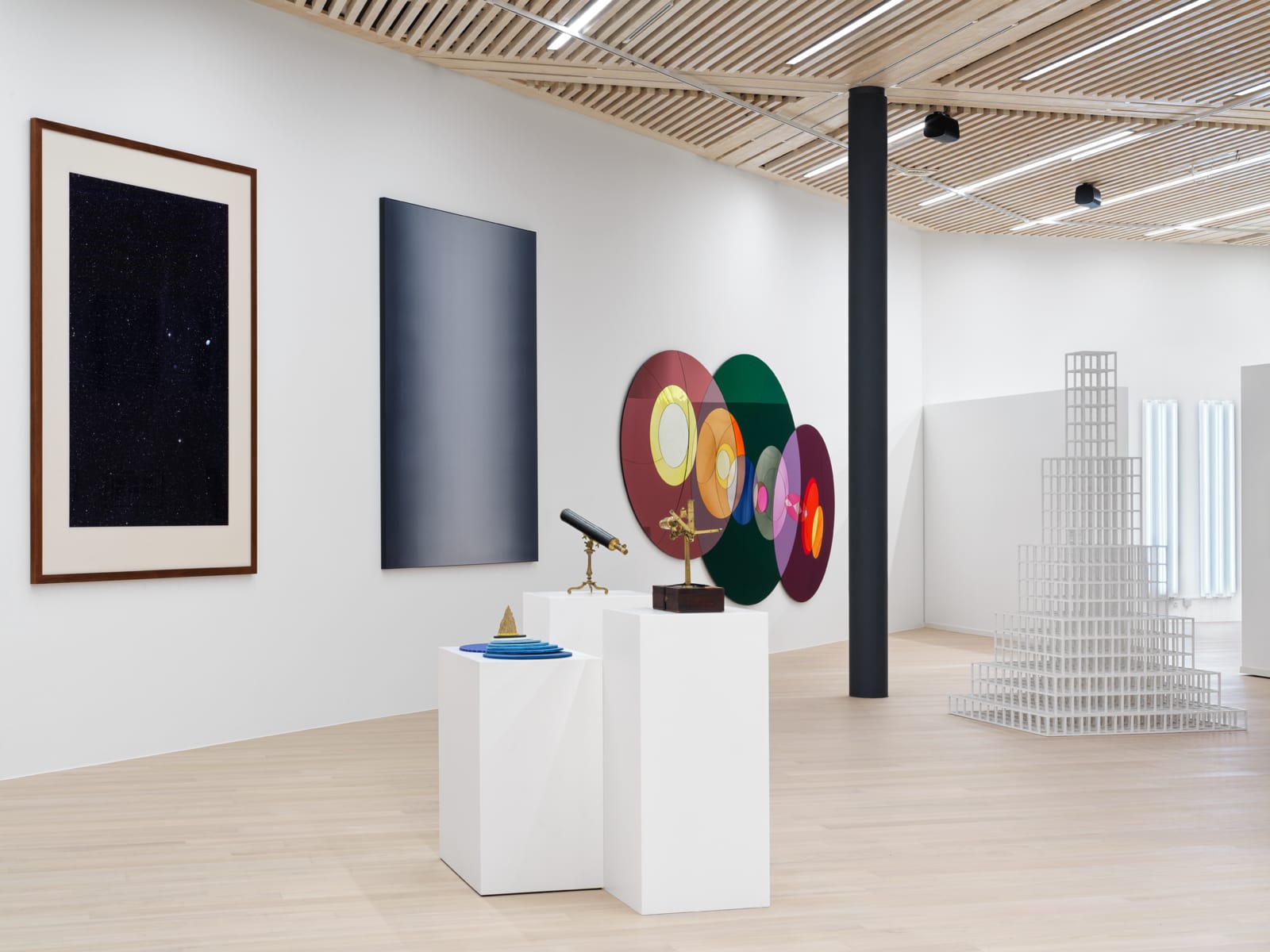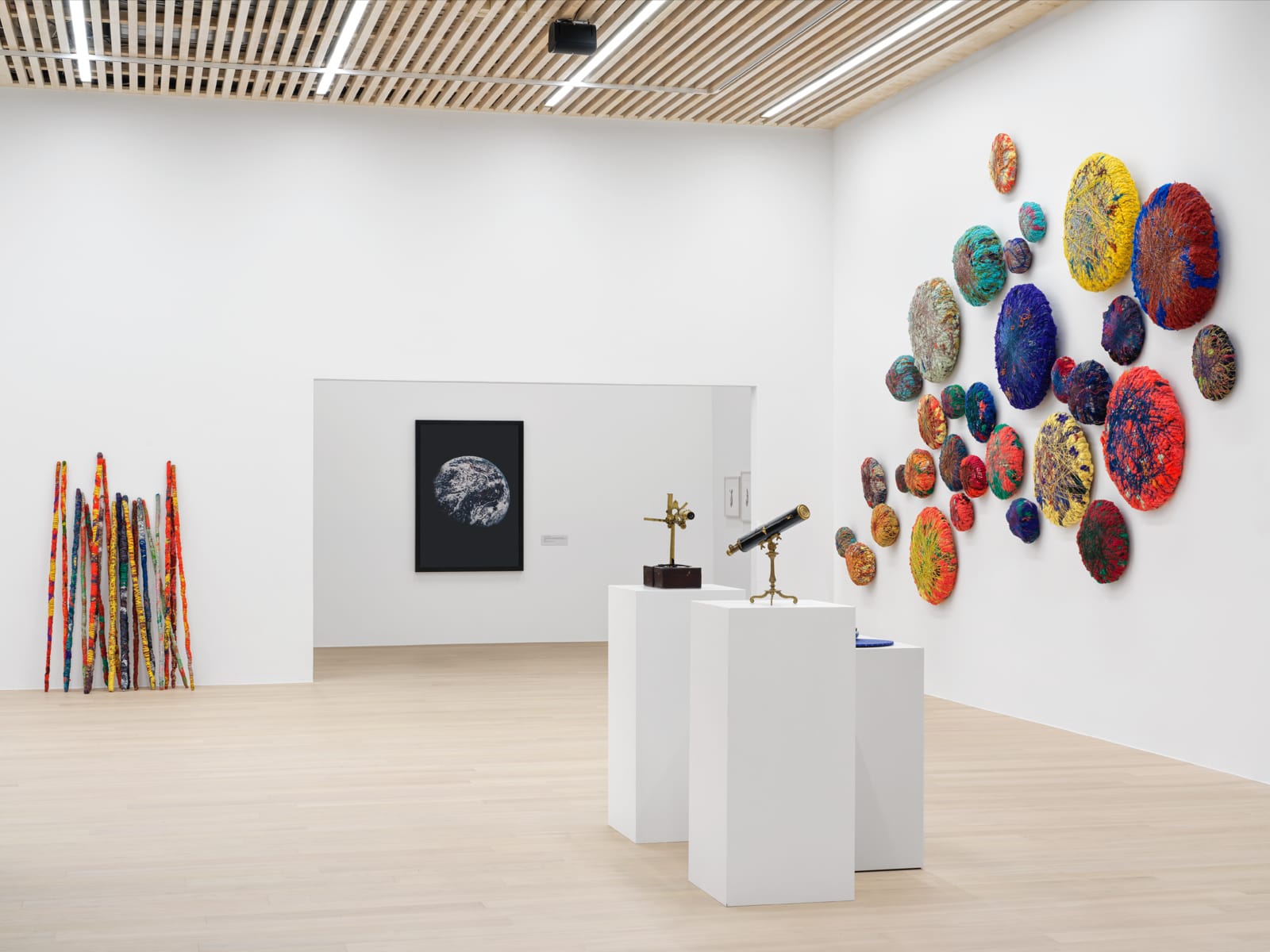 With rare insight into collective ingenuity over geographies and epochs, Gross brought together Jivya Soma Mashe’s Ants Spiral (2010), an acrylic and cow dung on canvas by the Warli artist from India, alongside antique Western curiosities, including a brass-and-leather Gregorian reflecting Telescope fashioned in 1754 by one Claude Paris. And this was only the first floor. Above, Niki de Saint-Phalle’s Lily or Tony (1965), a wall-hung painted polyester resin sculpture pressed its arms up against the archaisms of anthropomorphic relief; nearby, (P.A.C.) An And Then (1970) by Sam Gilliam suspended acrylic on canvas in impressionistic folds of beveled edges, poised in light-born apparitions of movement.