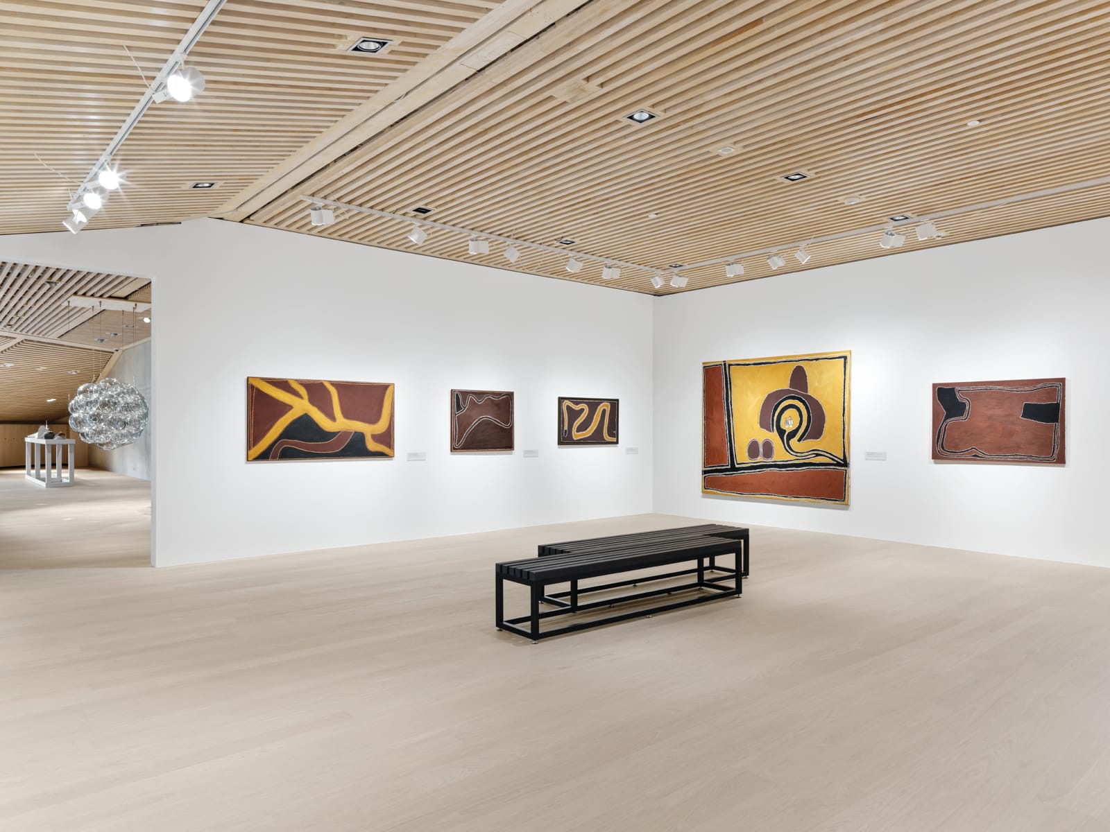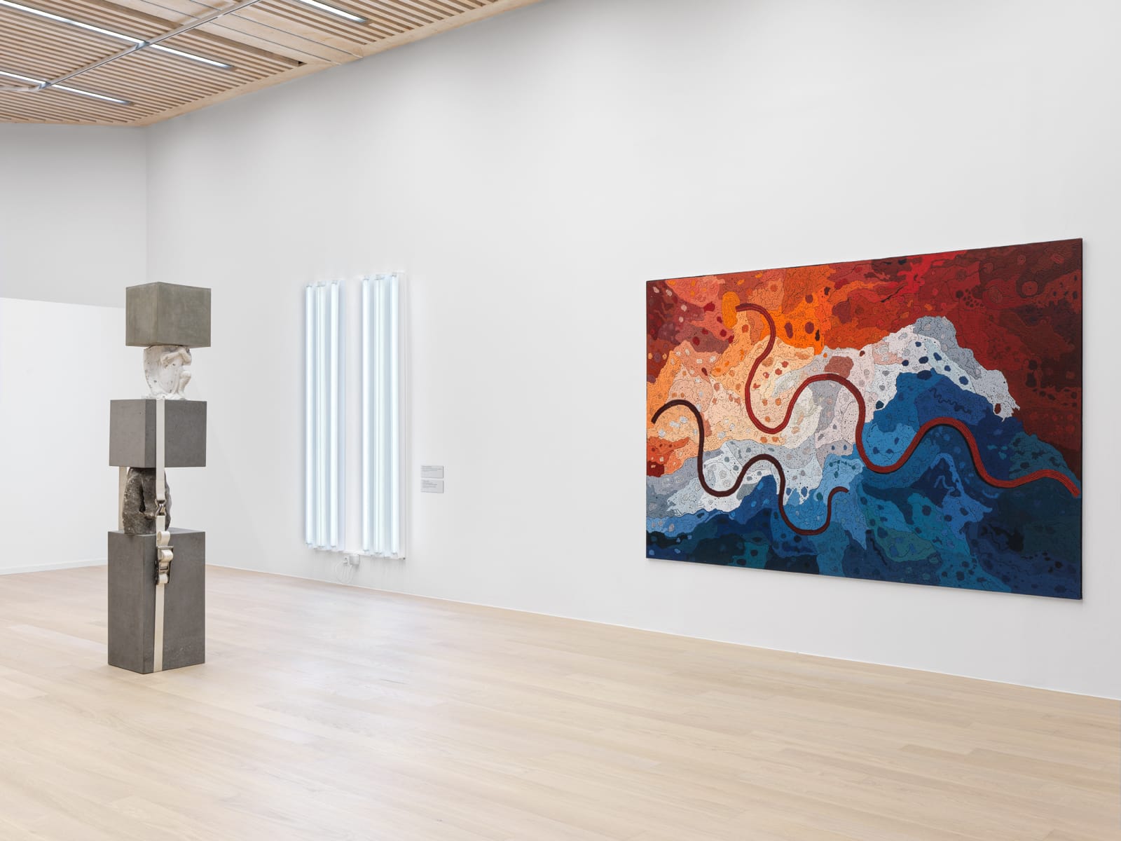 Olafur Eliasson’s Wasted but confident light (2021), a constellation of spectrally diverse, silver-colored glass orbs, entered into direct aesthetic dialogue with Sheila Hicks’s VARMAYANA (The Place of Shining Light) (2018), whose various colorful spheres blending linen, cotton, wool, nylon, among others, brought conceptual art to elementary form. And to see both works alongside Clifford Possum Tjapaltjarri’s Fire Dreaming (1996), an acrylic on canvas projecting the embodied spiritual intensity of Aboriginal mastery, was to behold the wonder that is being human: an innately creative force moving between the outer and inner worlds.