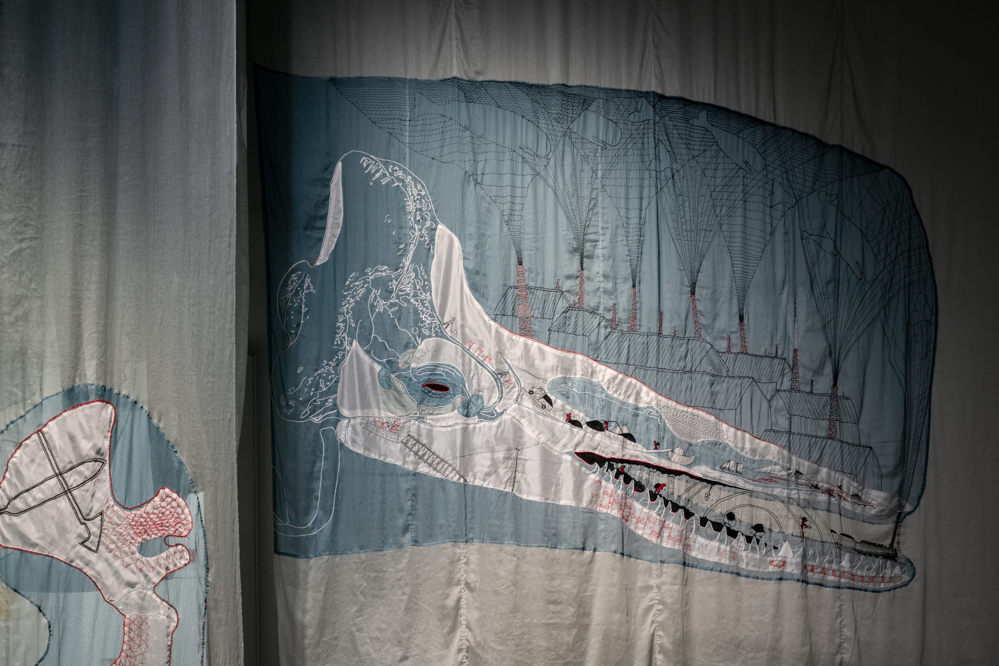 Hiroshima-based artist Sakura Koretsune’s After Efflorescence: Awakening the Whale Beneath Us (2025) traces the intertwined relationship between cetaceans and humans from prehistory to the present, notably within the context of Aichi prefecture. Recalling forgotten uses of whale bones and organs in tools, ceramics, and postwar survival, her project transitions layered research into an embodied experience. Skeletal fragments, clay pipes, and bone-shaped ceramics are placed beneath suspended translucent fabric sheets embroidered with images of a whale’s cross-section, inviting viewers into a bodily passage through history. Rui Sasaki’s Unforgettable Residues (2025) deepens this meditation on nature and time, drawing on seasonal research of local plants. Installed in Seto City’s former Nihon Kosen bathhouse, her glowing glass tablets encase local plants—historically consumed to fire kilns—that have been reduced to ash, crystallizing their lingering spirits. Reflective and transparent, the glass holds the tension between extraction and preservation, revealing traces of life as well as our own mirrored images caught in the act of remembering.