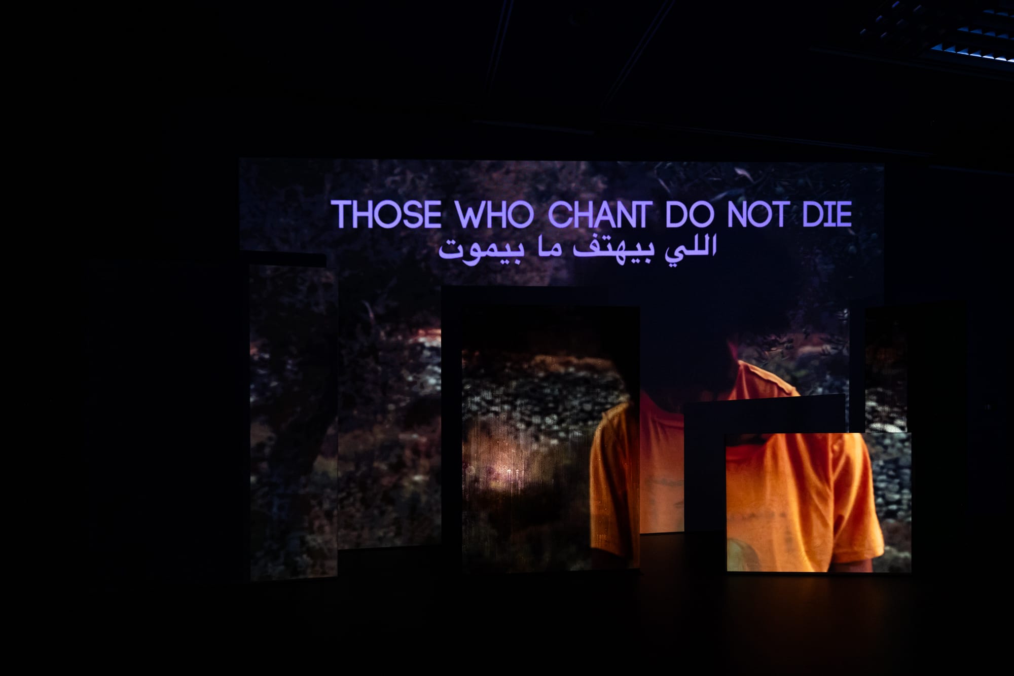 This insistence on regeneration amid devastation is echoed in Bassim Al Shaker’s vibrant painting series Four Minutes, one of which—Sky Revolution (2023)—is suspended from the ceiling. The Baghdad-born, New York-based artist reimagines the bombings he witnessed during the Iraq War as vibrant explosions of color against darkness, embracing life’s precarious, solemn beauty. Similarly rooted in histories of destruction and reclamation, Hrair Sarkissian’s Stolen Past (2025) bears witness to the damage wrought during the Islamic State’s occupation while actively seeking to recover what was lost. A series of 3D-printed lithophane panels mounted on illuminated plinths reconstructs stolen and destroyed artifacts from Syria’s Raqqa Museum, which once housed cultural artifacts spanning from the Paleolithic era to medieval Raqqa ware. Seeming to float out from their flat surfaces, the hauntingly tactile images embody an act of remembrance as protest, asserting the right to existence itself.