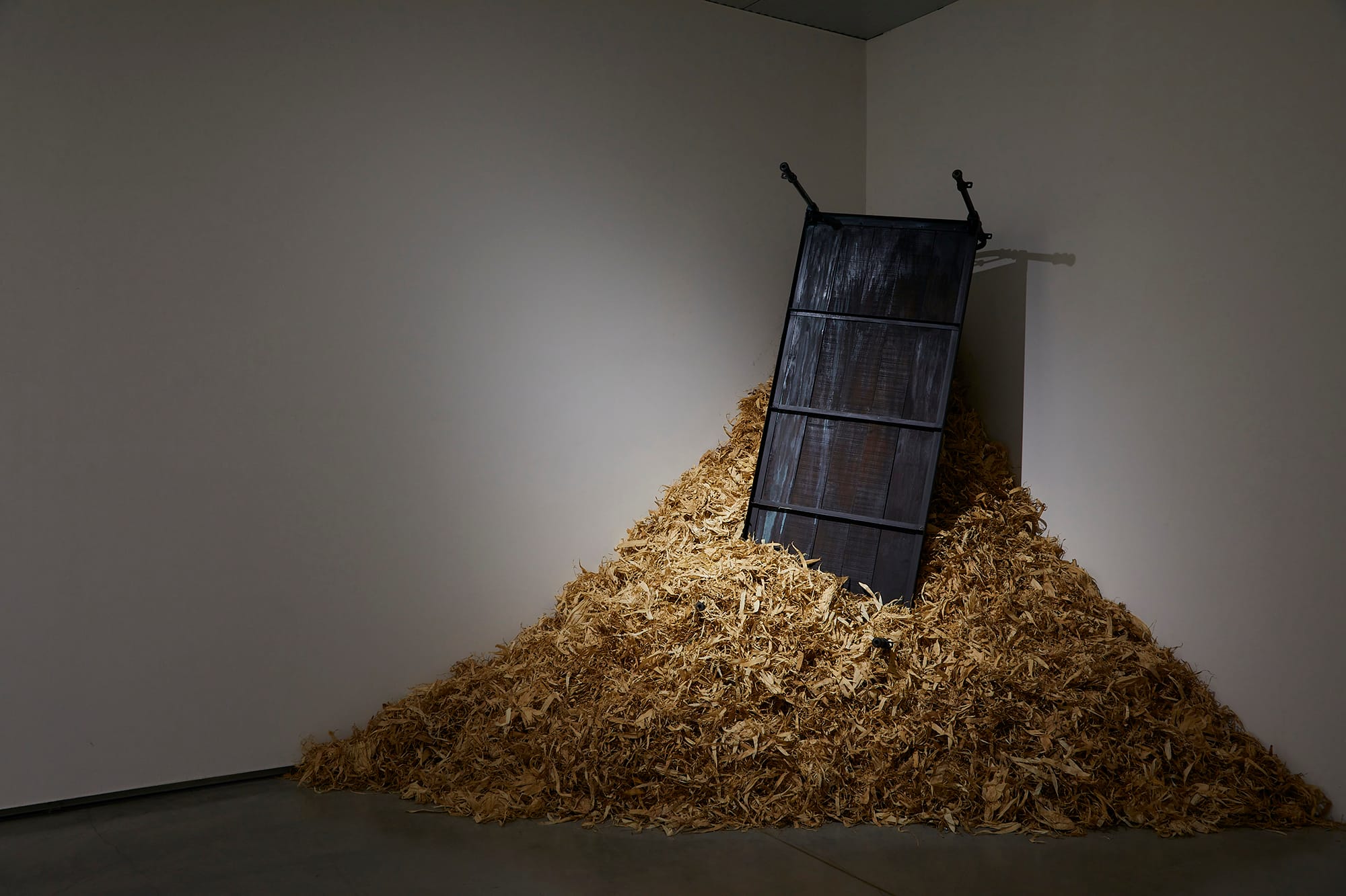 Death has been a constant companion to Rasdjarmrearnsook’s practice. It sits by the side of an upturned bed frame—a shocking flip—in her installation Has Girl Lost Her Memory? (1994/2025). The empty bed is half-buried under a pile of dried corn husks, mementos not only of her childhood snack but also of the making of funeral wreaths in her village. An eerie silence exudes from this material, as if death were simultaneously biding time and beckoning us toward eternal rest. Rasdjarmrearnsook recalled her mother’s funeral when she was merely three, the first of many that haunt her life. Her memories thus tread the line between life and death—inherently inextricable. The vacant bed reappears in another installation, Dinner with Cancer (Rebirth) (1993/2025), perched precariously on steps, strewn with intravenous tubes. On it sits a glass box—evoking the fragility of a heart with hollowed arteries. Bowls of black liquid that resemble diseased blood surround the bed, the walls behind them also darkened with ink. These unsettling objects invoke Rasdjarmrearnsook’s memories of her father’s passing in the hospital, of her own care and devotion until his last breath, and of life’s fleetingness and the futile attempt to hold on when death comes knocking.