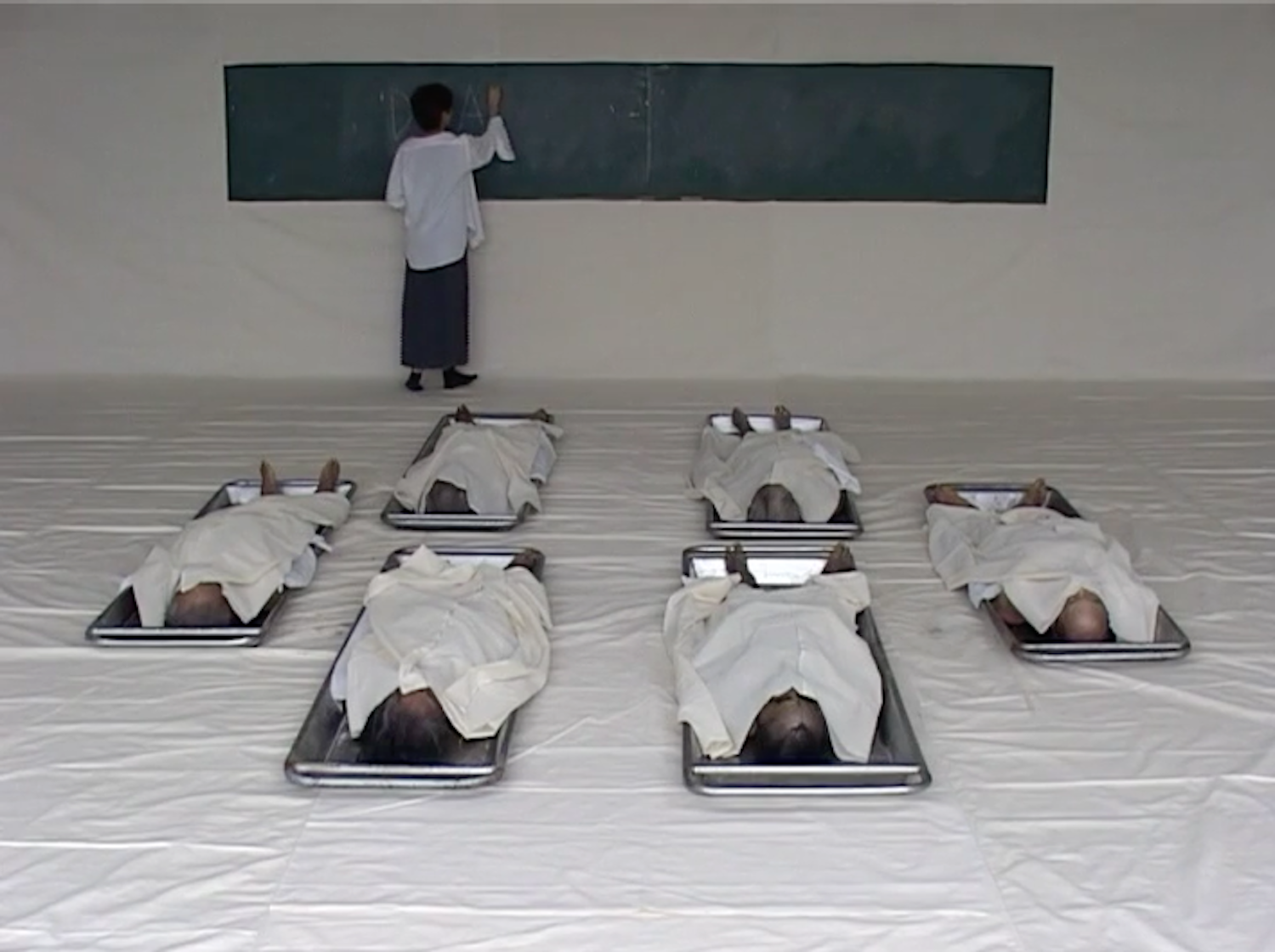 Rasdjarmrearnsook’s engagement with mortality balances between the conceptual and the visceral. In a triptych of video works titled The Class I, II, and III (all 2005), she recorded herself holding classes with actual corpses obtained from university labs. Laid out in trays and wrapped in white cloth with their faces concealed, the corpses continue their forever dream while she talks to them in her lilting voice about the leaves falling outside, the tragedy of life, and the beauty in minute things. At certain points, her voice croaks, as if overtaken by grief and empathy. The clean, almost ethereal composition of her classroom amplifies the heavy emotions weighing on Rasdjarmrearnsook’s heart. Her proximity to the deceased, both physical and psychological, allows an unfathomable transfer of memories, where the past seeps from the bodies to merge with her present—transforming both in the process. This series also marks the end of Rasdjarmrearnsook’s nearly decade long-long fascination with the dead body, from 1997 to 2005, as a vessel for memories, philosophies, and rebirth.
