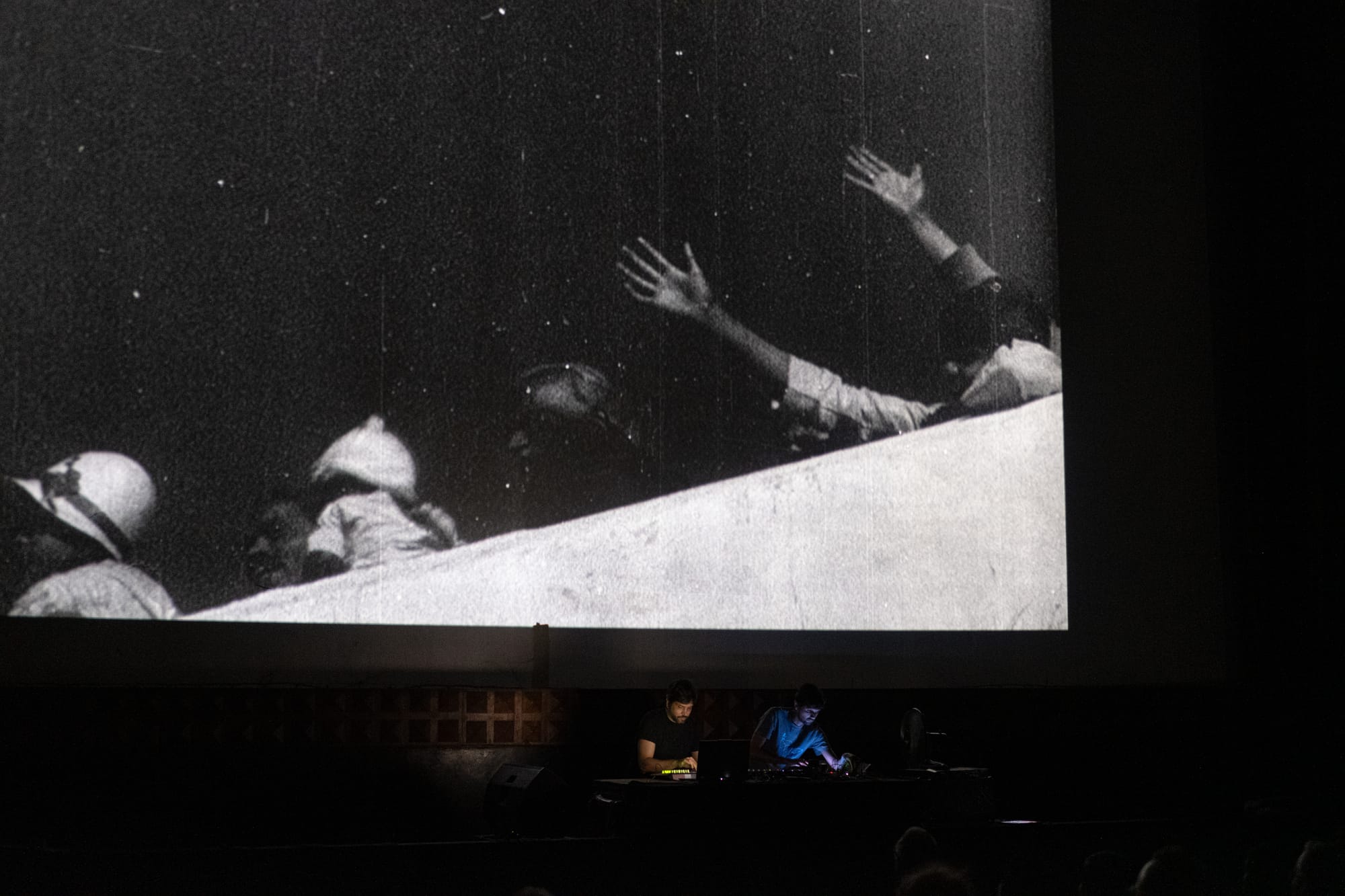 At the Rio Complex, the venue’s layered history confronts erasure through reenactment and disjointed performance. Once a site of midcentury cinematic optimism and later marked by the political violence of the 1980s, the cinema becomes a charged setting for Basir Mahmood’s A Body Bleeds More Than It Contains (2026). Developed with former workers from Pakistan’s declining Lollywood industry after the partial demolition of Bari Studios, the work is rooted in restricted access and irreversible loss. Unable to fully return to the site that used to be one of Pakistan’s oldest film studios, participants—both performers and audience—reenact fragments of memory through movement, song, and emotionally charged monologue. As chairs are dragged and bodies repositioned, a staged death and a mother’s lament recur, allowing memory to circulate. Rather than mourning disappearance, the work traces persistence, realigning performance, affect, and labor beyond the stabilizing logic of documentation: a shared presence in which lost fragments endure by entering an alternative mode of existence.
