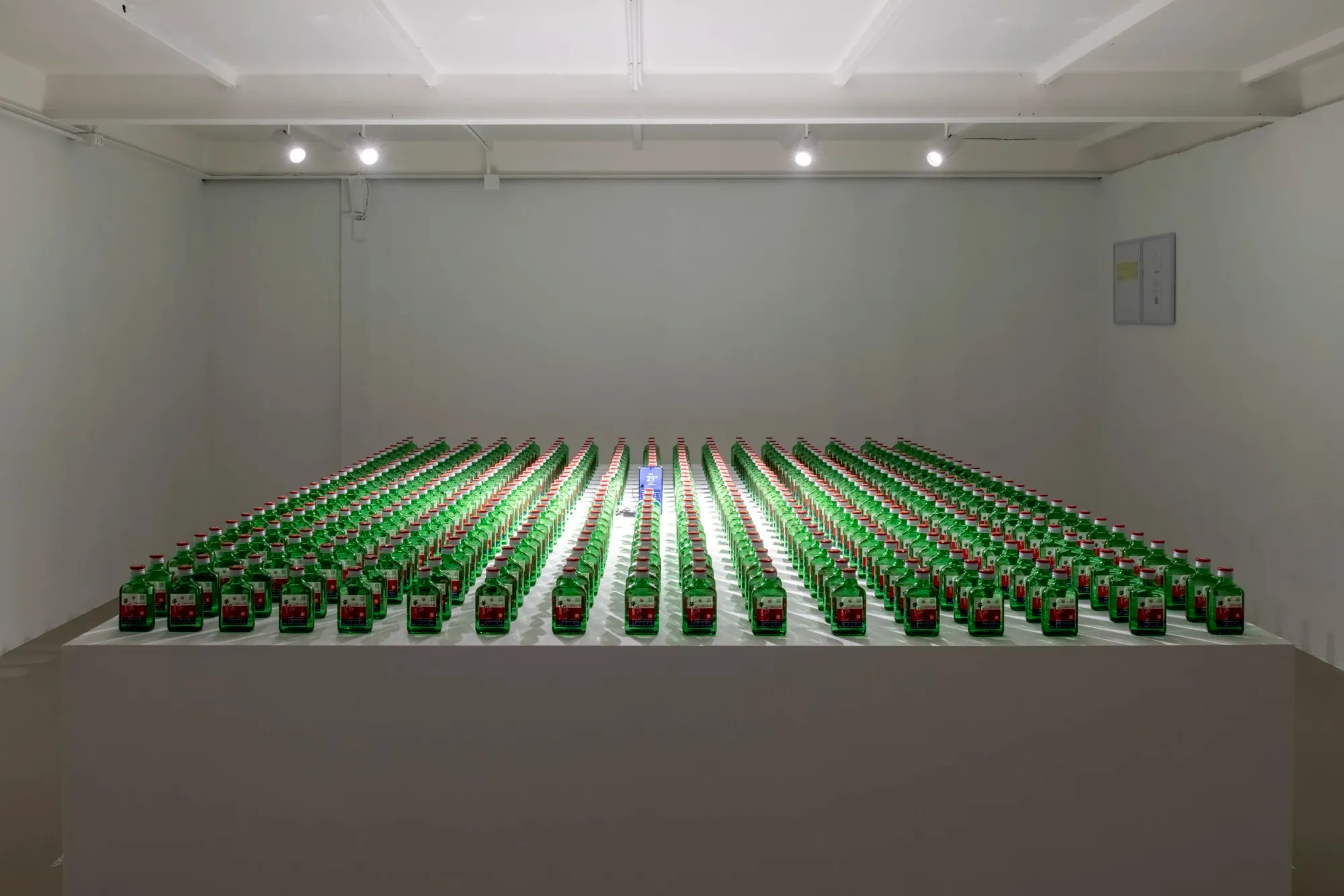 This logic also underpinned Decentralized Value Systems (2025), where a Huawei smartphone sat surrounded by 456 bottles of Erguotou—a liquor originating from and produced in Beijing, made largely from wheat. The arrangement created a near-sacred tableau: the emblem of Chinese contemporary technology encircled, even worshipped, by its agricultural counterpart which once drove a craze in the Chinese stock market. Quotes displayed on the wall reveal that the two products were acquired at the same price—worth here is visualized as mere equivalence, exposing the absurd omnipresence of price as determinant. If wheat and data are infrastructures of survival, liquor and consumer electronics are commodities of desire, tethered to the same economic circuitry.