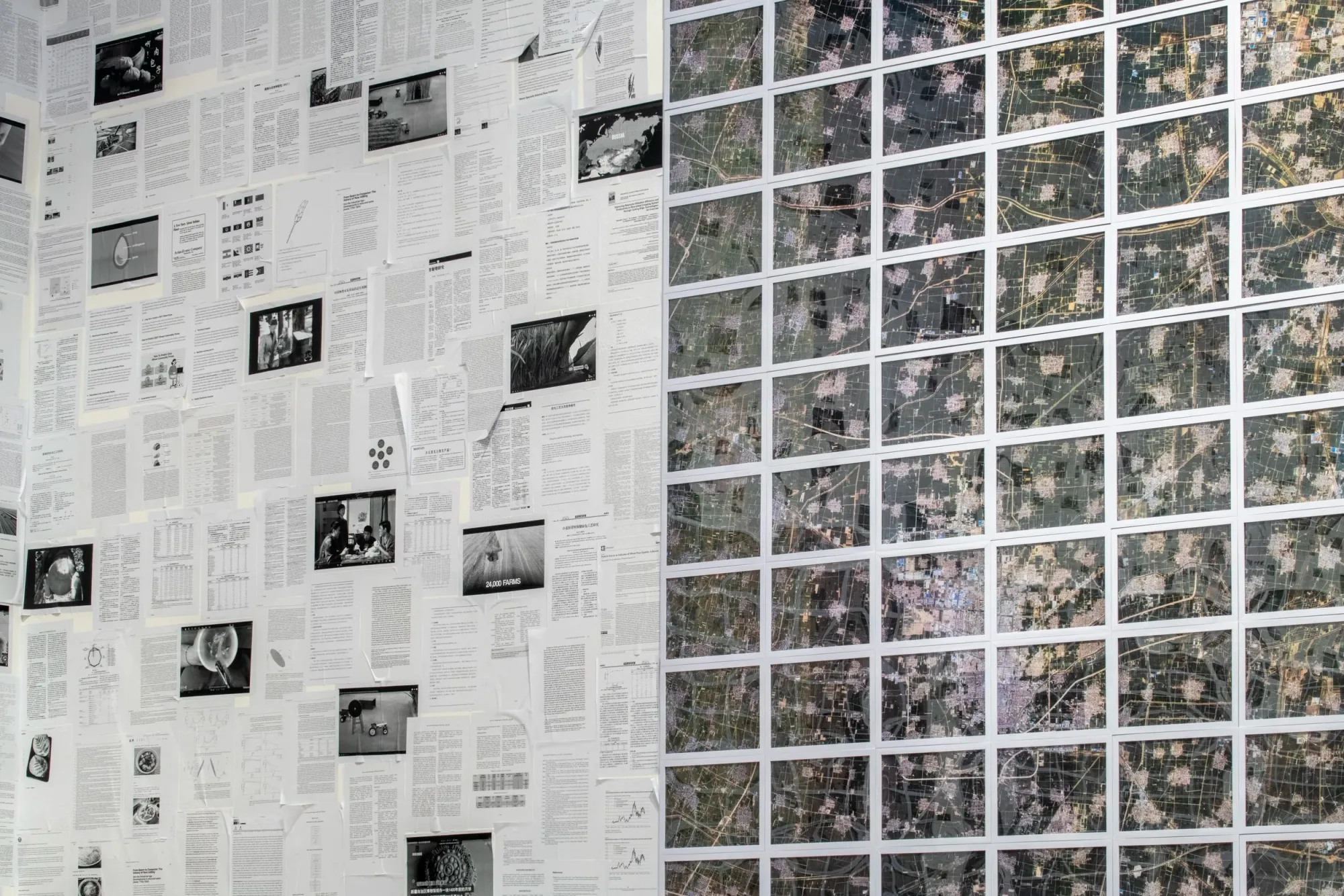 When I stepped into Chow and Lin’s exhibition “Even If It Looks Like Grass” at Bounded Space, Huiyi Lin handed me a tiny binocular telescope—an unusual gesture that suited the ambitious installation well. Created between 2023 and 2025, the titular work centers on 11 large-scale aerial photographs of major wheat-producing regions and the architecture of data centers. Each is divided into grids, fragmenting the presumed seamlessness of satellite imagery, which in fact results from multiple instruments capturing data across different times. Around them, more than 4,000 sheets of paper covered three walls from floor to ceiling, charting the artists’ research process. Many were illegible from afar, forcing me to zoom in and out to decipher faint details or guess at fragments tucked high in the corners.