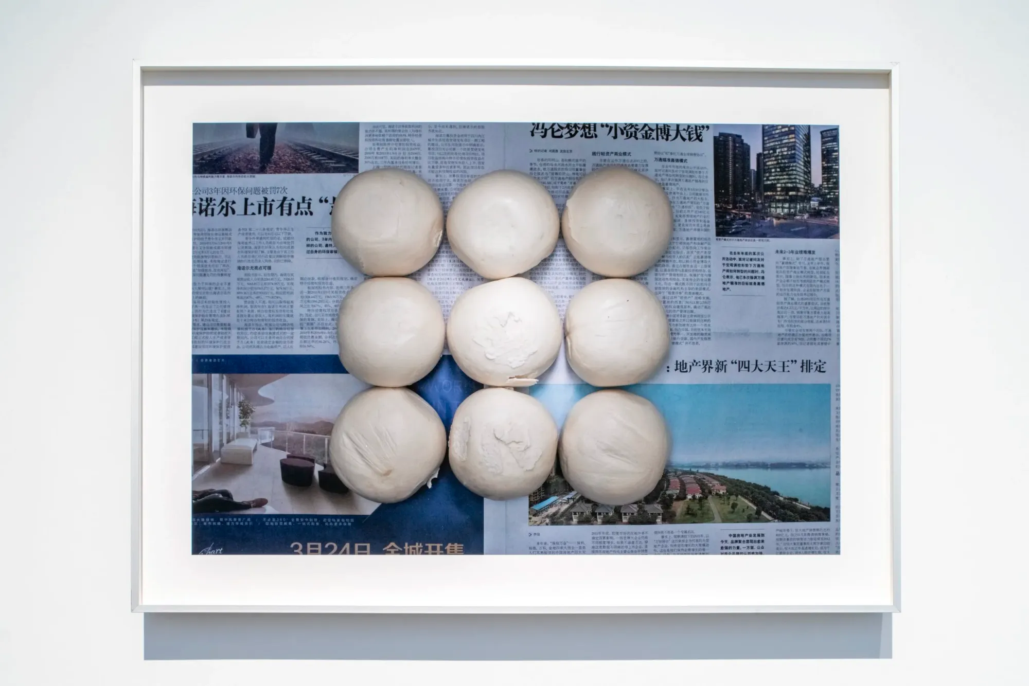 The artists’ working method fuses their respective backgrounds—Lin in economics, Chow in photography. Their long-term project The Poverty Line (2010– ) remains the clearest expression of the approach that borrows from economic sociology while insisting on visual form. Traveling across 38 countries, the duo calculated the amount of food that could be purchased on a daily poverty income, and photographed the results against local newspapers. In this exhibition, a small selection of images from the series featured wheat products from six cities—Beijing, New York, Rio de Janeiro, Addis Ababa, Paris, and Sydney. Here, a sociological metric is translated into a stark, serial image: at once statistical comparison and visceral display. Chow and Lin’s methodology shifts between structural perspectives, such as global food systems and comparative data, and intimate registers, such as the rituals of eating and the minutiae of daily life, making abstract numbers legible as lived experience.