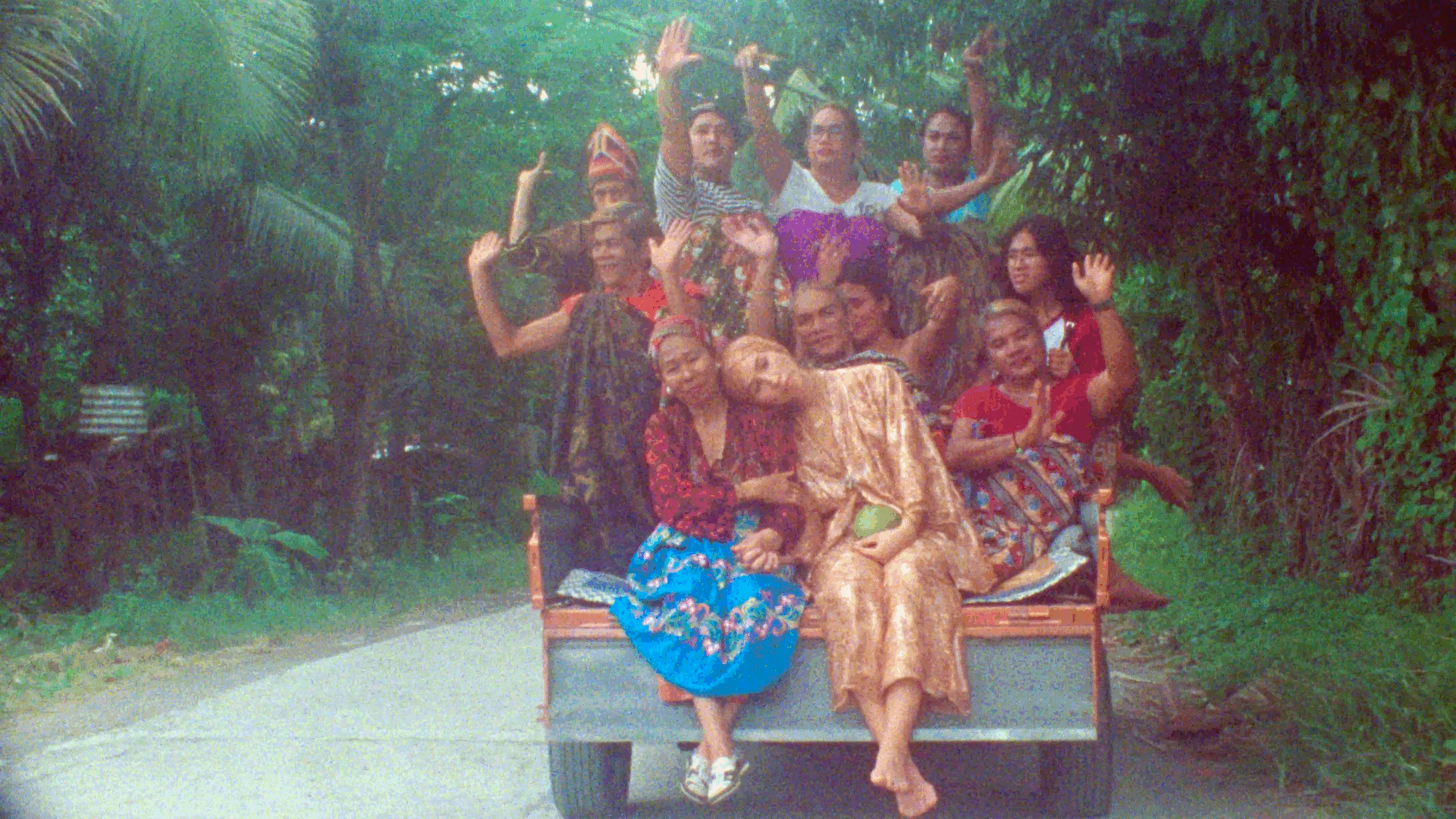 Meanwhile, in the Sulu archipelago and in the Sabah of the Philippines, Australian Filipina artist Bhenji Raturns to ancestral knowledge through the pangalay dance. In Biraddali Dancing on the Horizon (2024), she perfects her craft under her mentor’s tender influence while drawing on legacies of trans sisterhood and expression from the community that gathers around her, ascending into the role of the mythical horizon-dancer Biraddali by the end of her sensuously hazy film. At Min Sen Machinery—another of Ghost’s reclaimed venues—she too weaves a thread of solidarity from the Philippines, through Bangkok, into the crises of the world at large, inviting us to witness her transformation seated on a woven mat that simply reads “FROM SULU TO GAZA.”