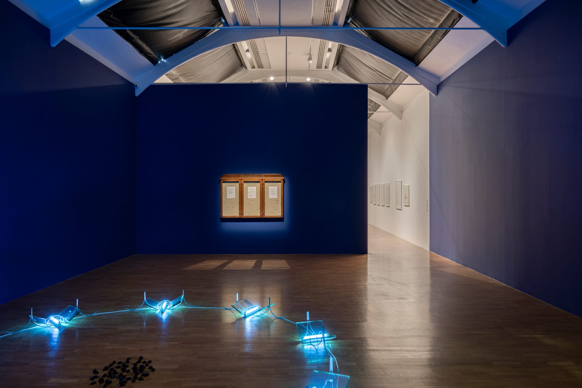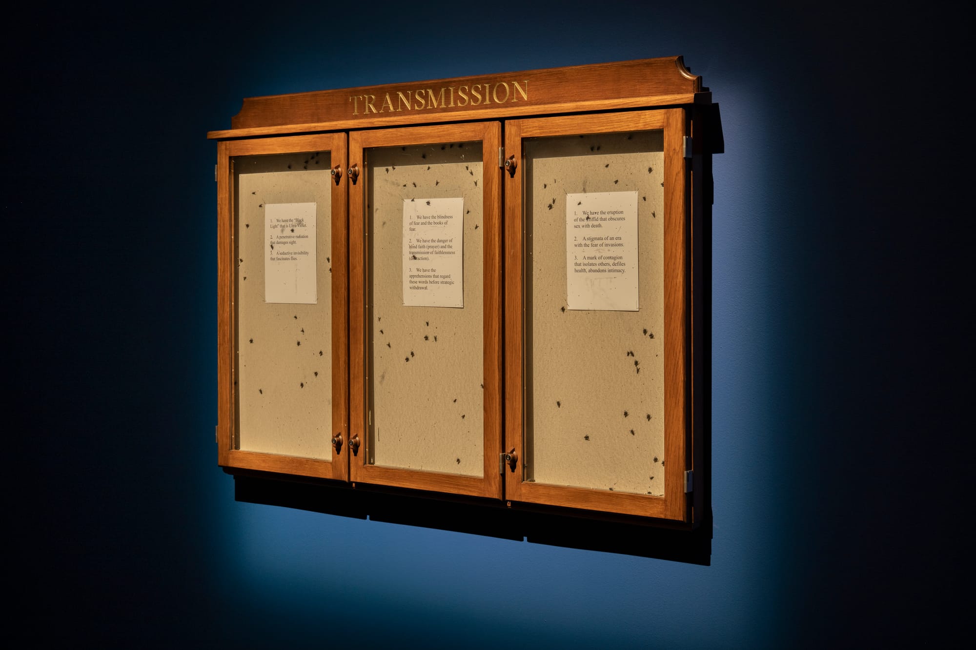 The exhibition reached its climax with Transmission, the installation Butt created for his MFA graduation show. Nine perspex books encircle a pile of protection goggles, arranged with ritual solemnity. Each book is etched with Triffids, the fictional alien prophets of apocalypse, which only become legible under ultraviolet light—invisible yet blindingly hazardous. Viewers could only reach for the goggles in the center by traversing the circle. On the opposite side is a reconstruction of a work colloquially known as the “fly-piece:” in a sleek wooden vitrine, viewers observed flies confined within—a morbid, near-religious narration of life and death. During their brief lives, the flies fed on sugar-soaked paper, on which Butt had printed his response to the HIV/AIDS denialism of his time:
