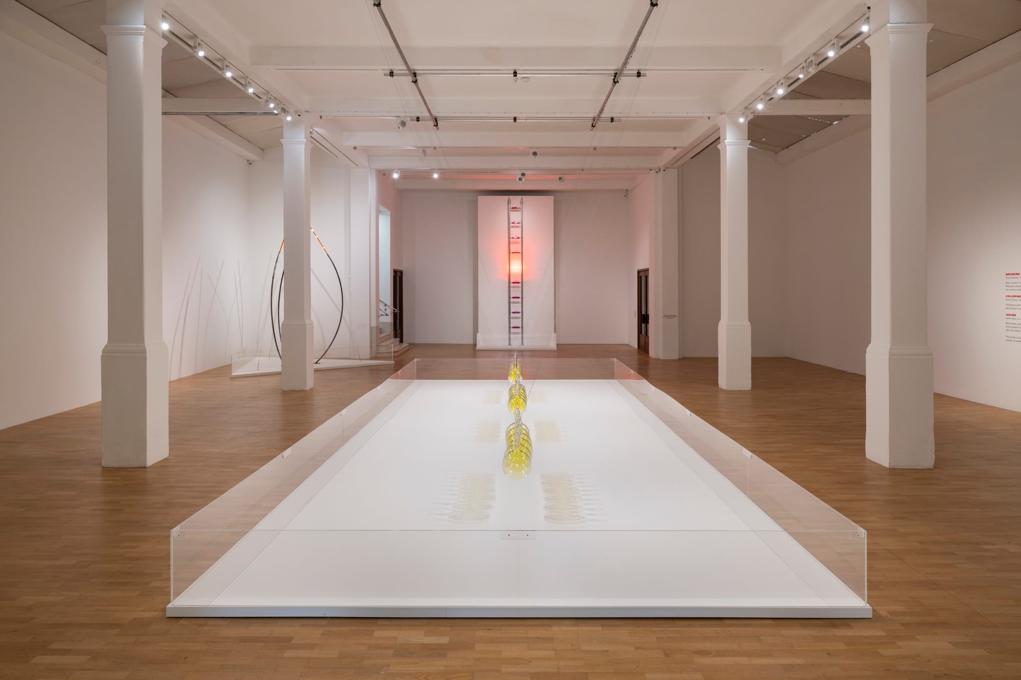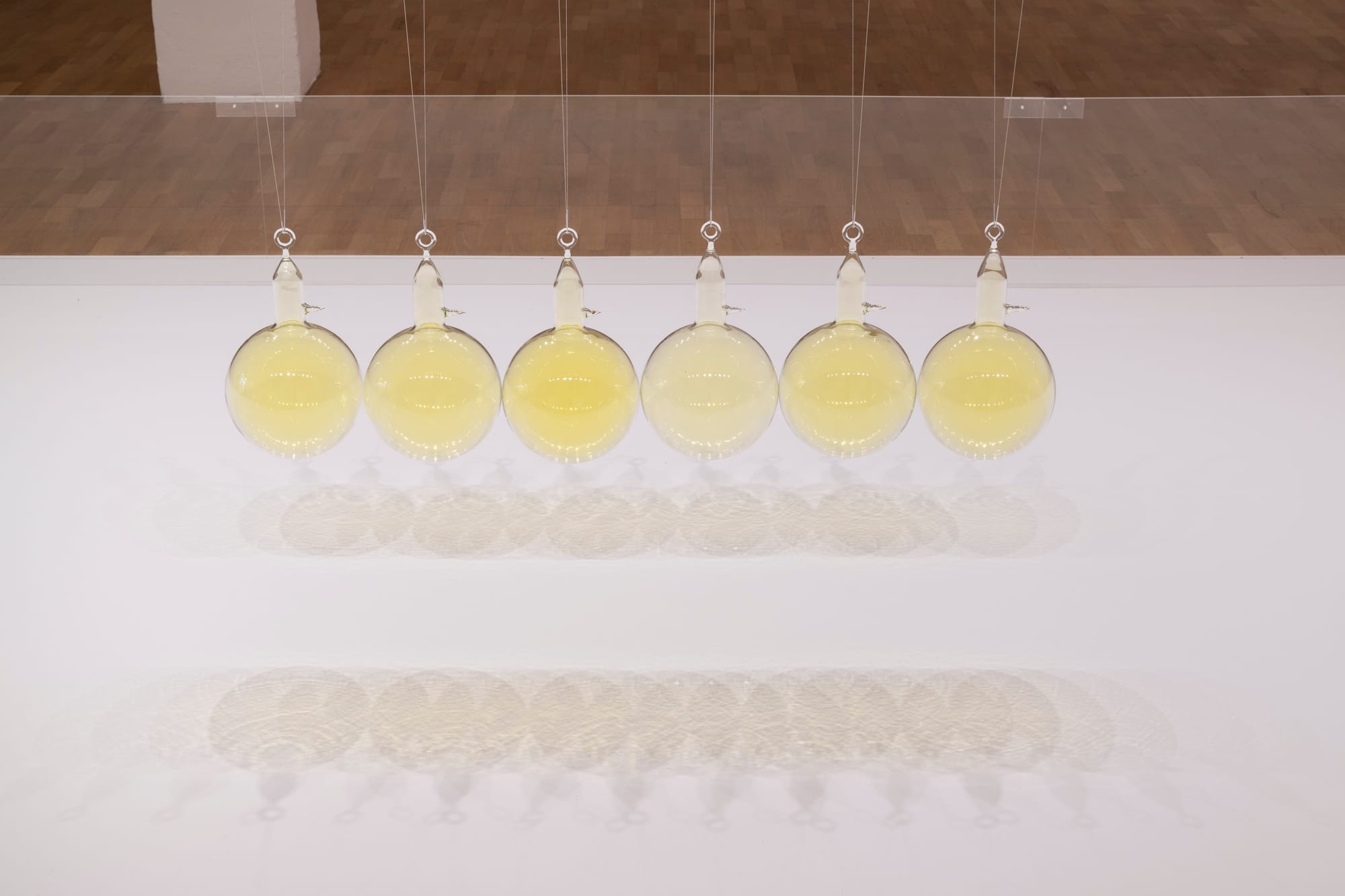 Before his untimely death in 1994 at the age of 32, Butt completed two large-scale multiwork installations: Transmission (1990) and Familiars (1992). Familiars kicked off the exhibition with the aforementioned Substance Sublimation Unit, in which an electrified ladder leads to nowhere; Familiars 2: Hypostasis (1992), a work where three steel arches balance against each other, with amber-colored bromine shining at their tips; and Familiars 3: Cradle (1992), where Butt substituted the swinging metal spheres in Newton’s cradle with 18 delicate flasks of chlorine. Created against the backdrop of AIDS, the series encapsulates an unsettling struggle between longing and fear, translating it into a mimetic situation with medical precision. The inorganic and sterilized surfaces drive one’s eyes to seek traces of fleshy warmth, but what awaits is the toxicity of halogens.