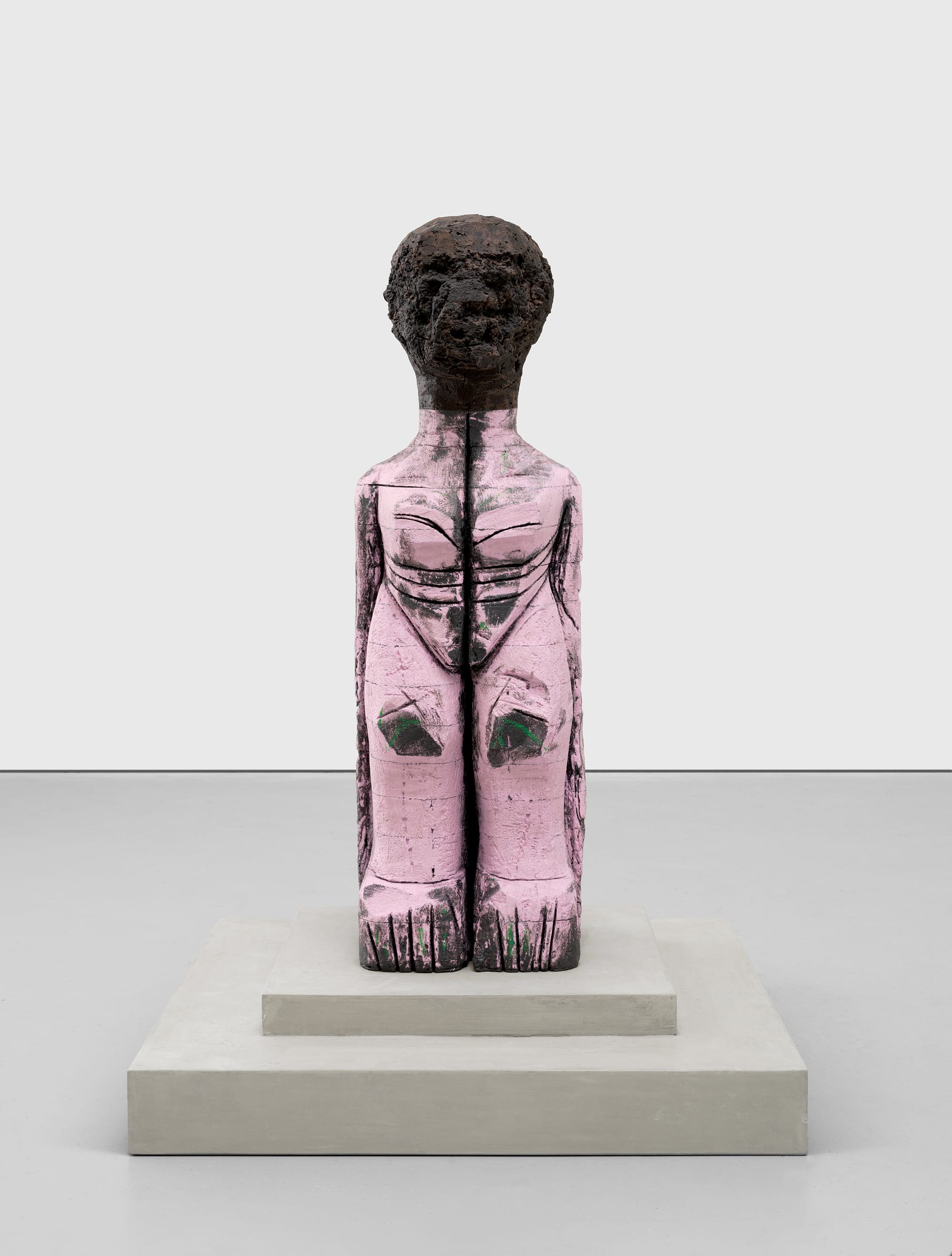 Other Giacometti works in the show include Four Women on a Base (1950), a haunting group of vertical forms that seem to oscillate between people and trees, and Composition with Three Figures and a Head (1950), which miniaturizes human presence to the point of abstraction. These pieces are thoughtfully echoed by Bhabha’s smaller sculptures—heads and limbs made of clay, wire, and salvaged wood—that evoke both relic and ruin. While Giacometti’s palette is uniformly austere—bronze, plaster, shadow—Bhabha’s painted surfaces and industrial colorations add a visceral texture. Her use of saturated reds and charred blacks, in particular, suggests open wounds and scorched earth, articulating a world of ongoing destruction is not only historical, but ongoing.