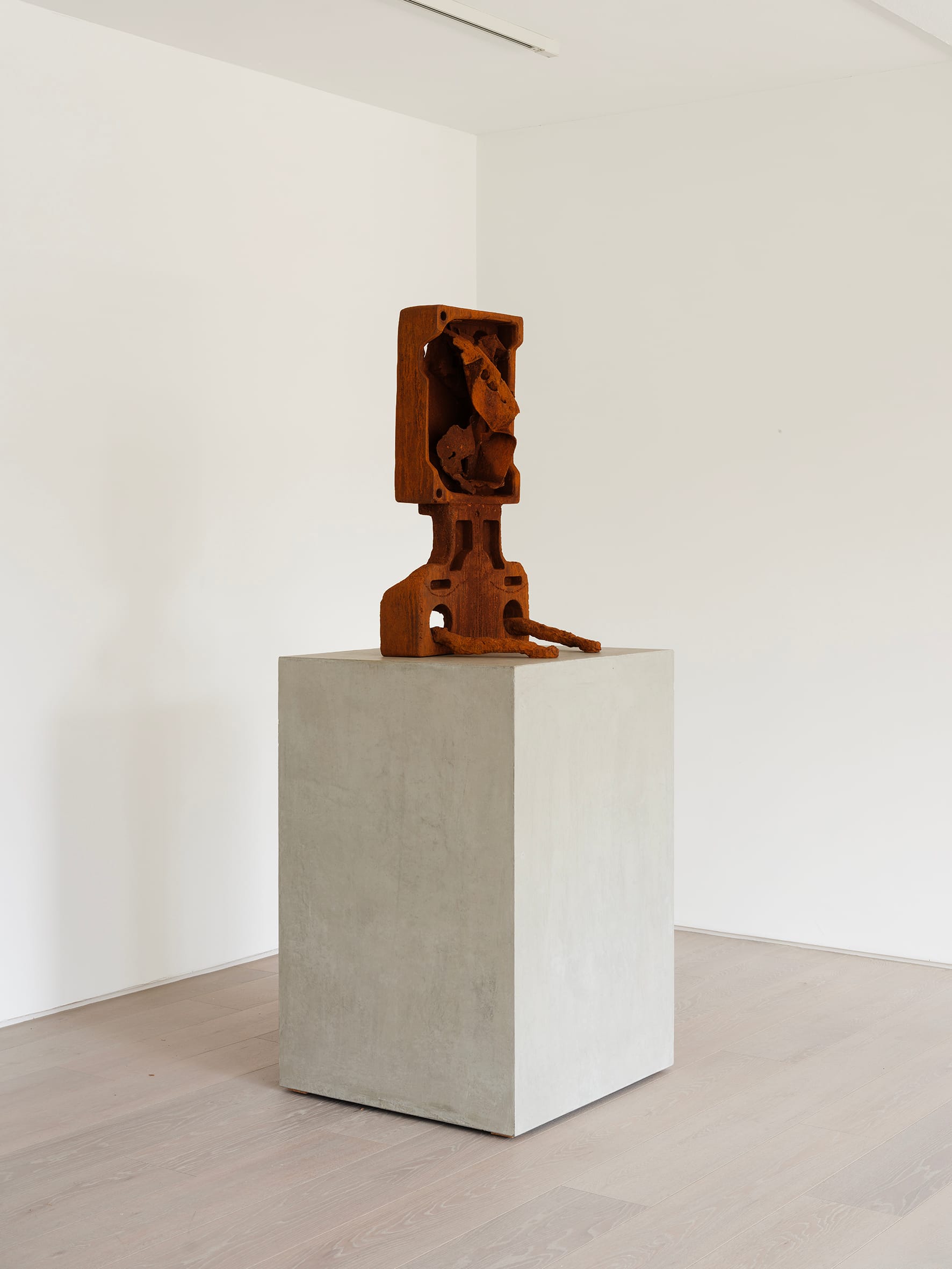 In contrast—but also in deep sympathy—Huma Bhabha’s practice draws on a hybrid palette of materials and references. Working with cork, clay, styrofoam, cast bronze, and found detritus, she creates imposing totems that feel both ancient and post-apocalyptic. Her recent sculpture, Lodger (2024), appears here in dialogue with Giacometti’s Man with a Windbreaker (1953)—both pedestal mounted pieces, but where the latter is stripped bare and moulded to resemble rocky terrain, Lodger exudes layers of bodily ruin and sci-fi mythos. Made of saltwater-treated cast iron, the increasingly patinated appearance of the sculpture will change with time and environmental exposure, thus representing a distinct engagement with decay and the ravages of time on the body. Another standout, Mask of Dimitrios (2019), a skeletal seated figure—constructed from found objects, metal pipes and plates, and deflated plastic bags—combines a humanoid face with an almost alien physiognomy, suggesting a body shaped by violence, memory, and survival.