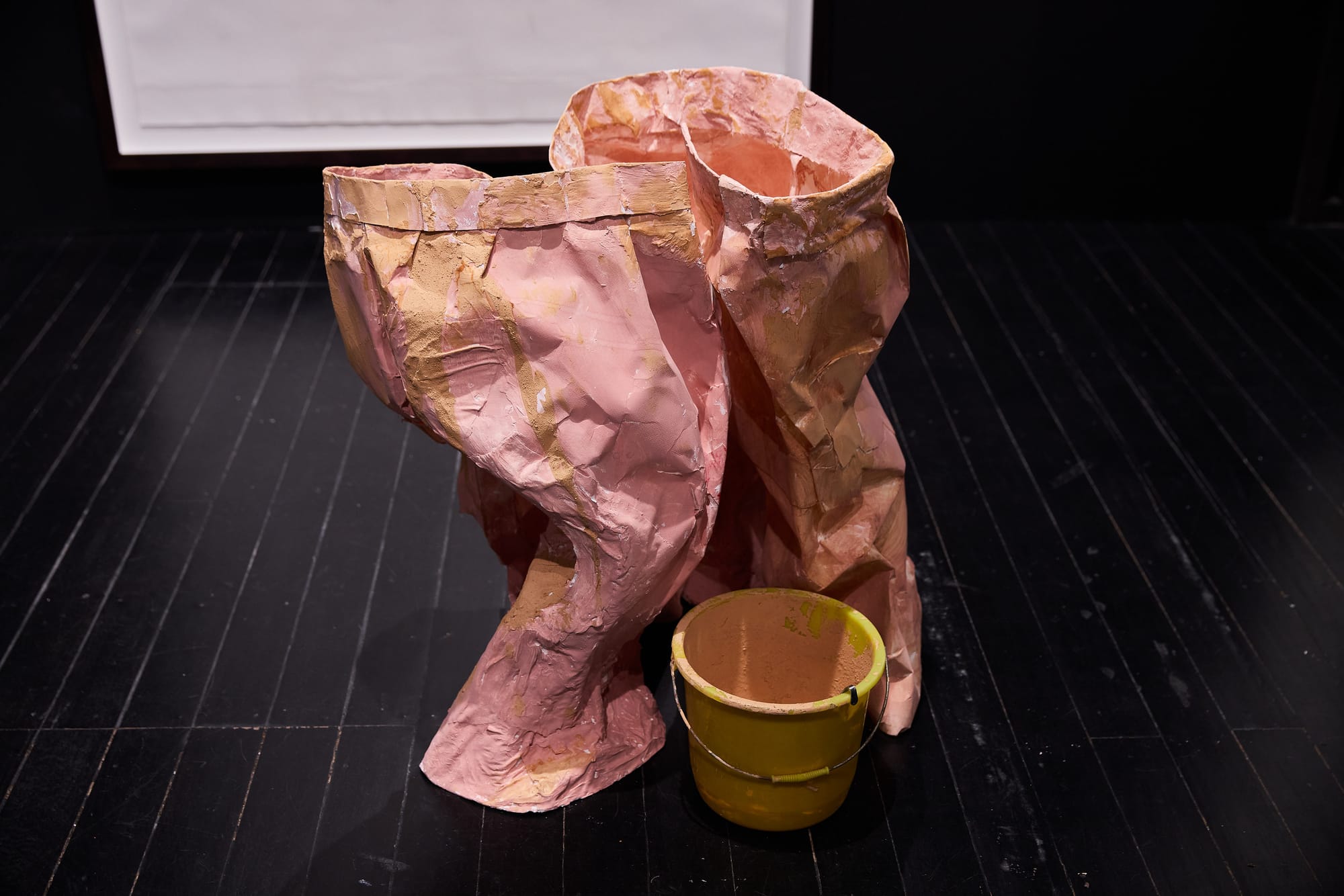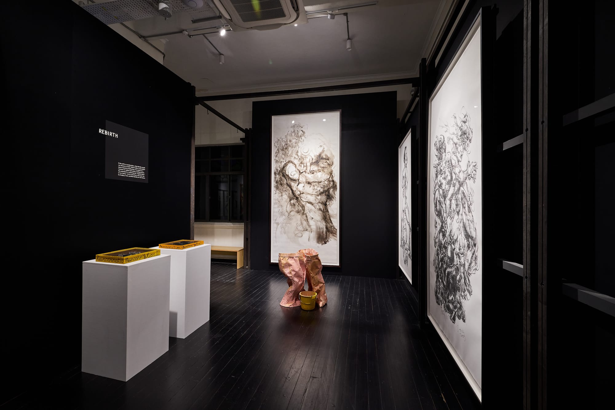 The show ends with “Rebirth,” tucked within the Caroline Verandah. Rather than closure, the section proposes rupture without resolution, its logic resembling samsara—cycle rather than release. Tang Da Wu’s ink drawing Kill All Artists (n.d.), showing a hand gripping a gun, imagines the destruction of the self as a condition for renewal. As co-curator Aaron Teo notes, citing Tang, artistic creation begins with the artist arriving with an “empty glass”— setting aside ego and accumulated scripts so that something new can emerge. Installed beside it, In Broad Daylight, I Do (2024), with trousers formed from local soil, returns the gesture to the ground. Made through a performance in which Tang repeatedly tried to fit himself into oversized paper clothing—tearing them, fumbling, trying again—the work renders renewal as process: awkward, iterative, and materially bound to the earth.