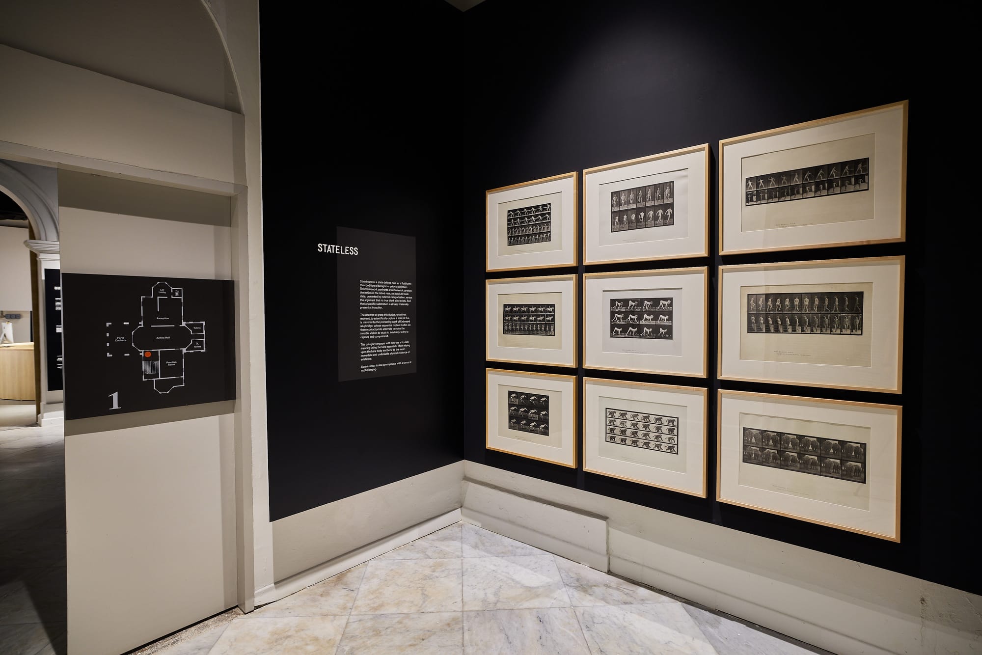 “Stateless” confronts the fantasy of the blank slate, insisting that the figure always arrives marked and resistant to neat classification. Eadweard Muybridge’s motion studies line the wall in disciplined grids of humans and animals, staging a system of scientific capture that promises clarity. Yet a sequence of a child with polio unsettles this taxonomy: crawling on hands and feet, the figure’s postures echo the quadrupeds nearby, collapsing the grid’s categories and exposing their limits.