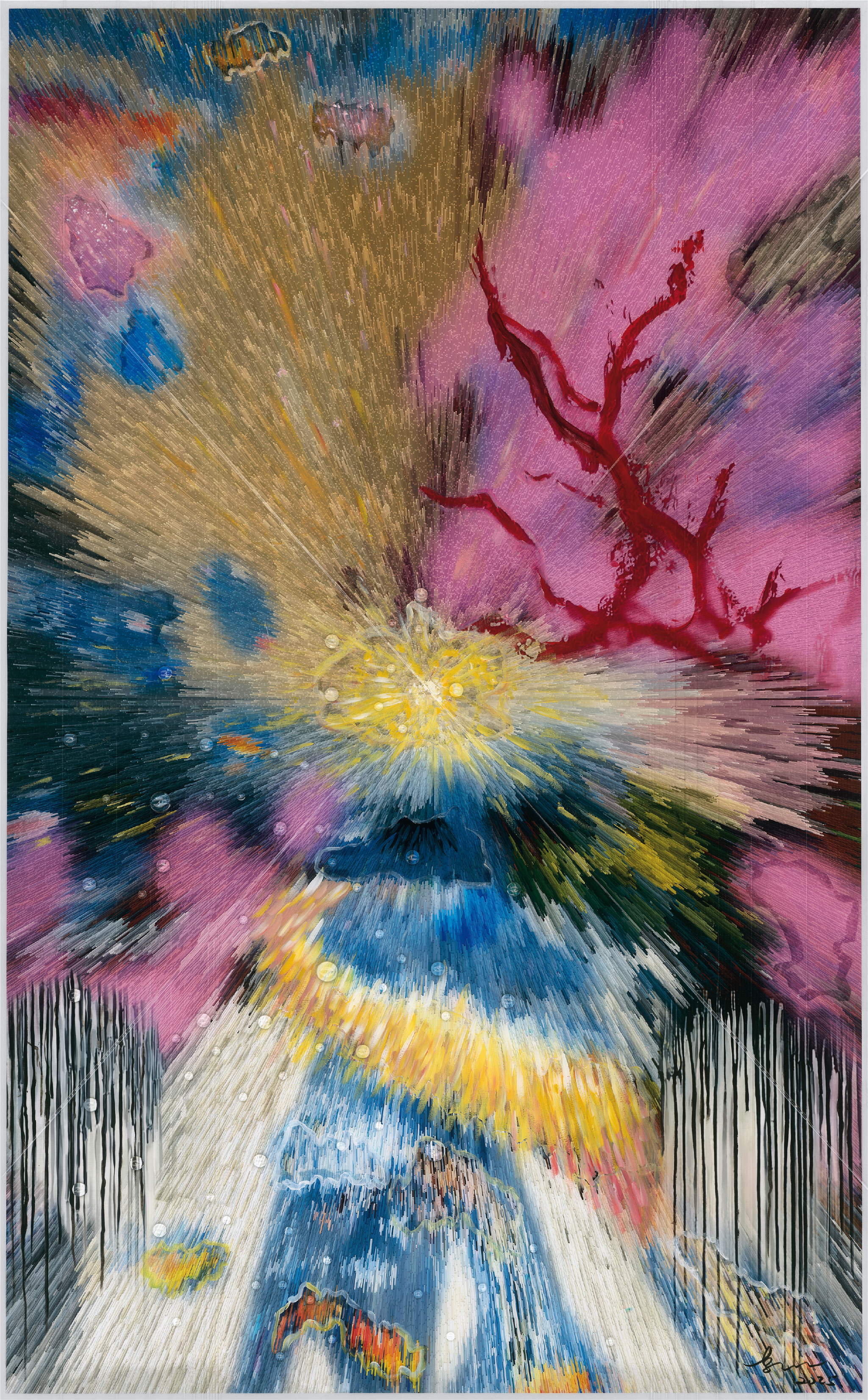 BAISHUI, Shimmer 1, 2025, mixed media and acrylic on canvas, 120 x 194 cm (left); and Shimmer 5, 2025, mixed media and acrylic on canvas, 120 x 194 cm (right). Courtesy the artist and Powerlong Museum, Shanghai.