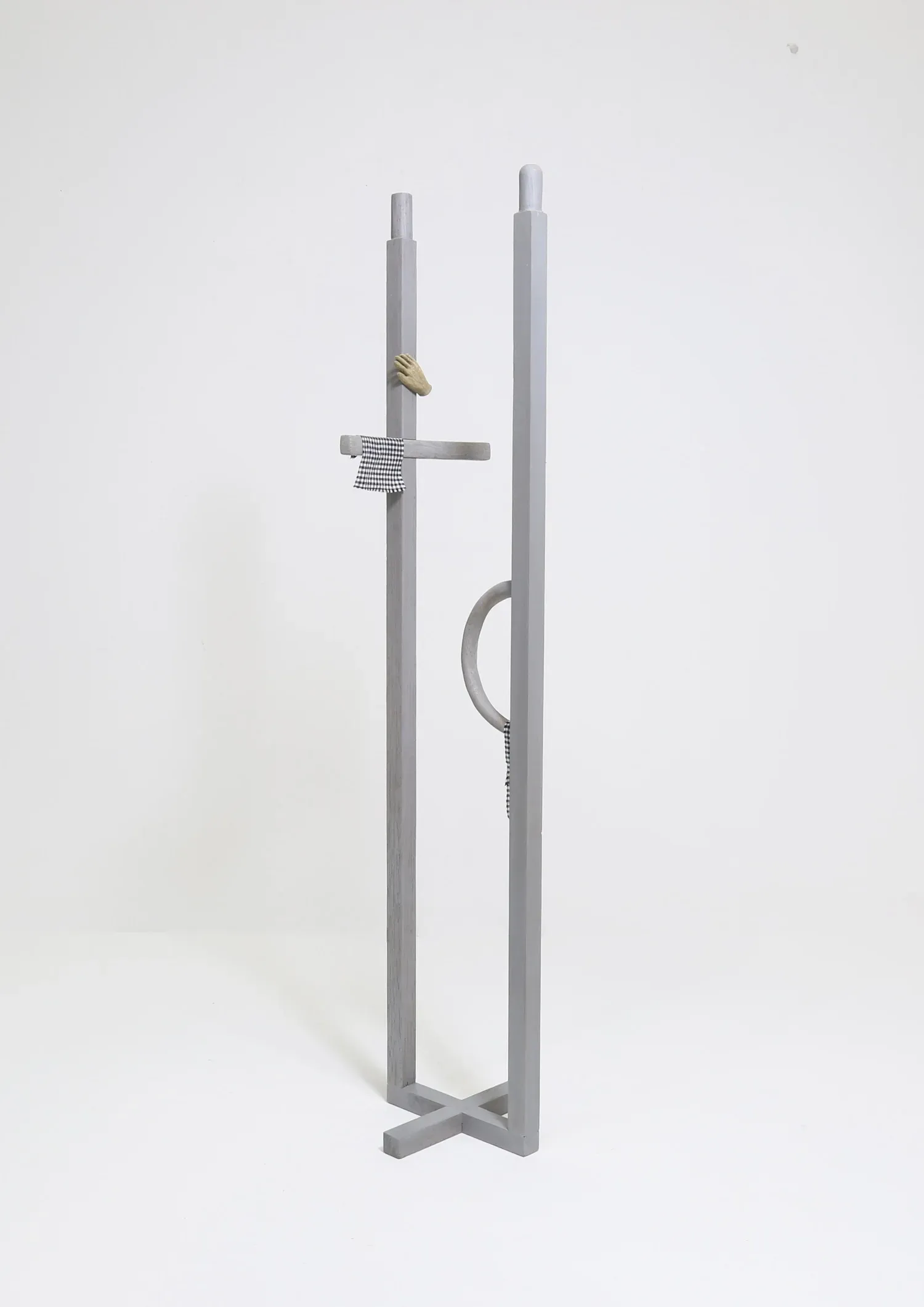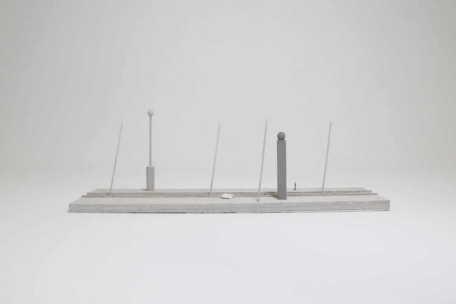 The recalibration of scale began at the entrance. Kenji Ide’s miniature wooden sculptures, slight and spindly, felt like half-built props for a half-written play—forgotten, estranged, yet uncannily familiar. Structure of Encounter (2024) unfolds as a solemn diorama that promises secrets but divulges none. The swaying matchsticks in This Rain Will Continue (2024) lean into an invisible wind, a stray paper scrap hinting at a script abandoned mid-rehearsal. And in Distance of Warmth (2024), a slender armature suspends a minuscule hand frozen mid-motion—neither grasping nor letting go—a fleeting trace of human presence already halfway out of the scene.