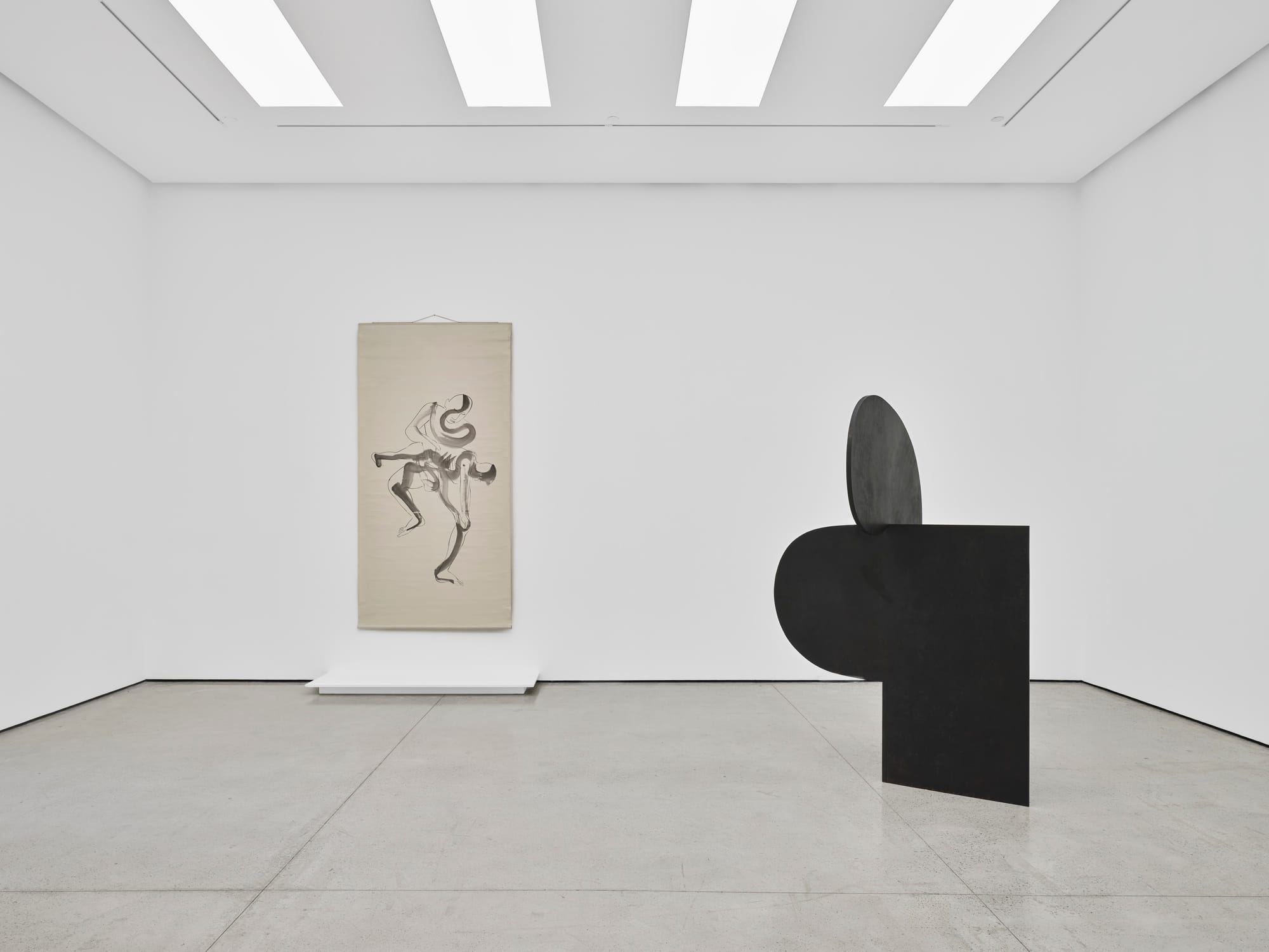 Although Noguchi never developed his practice of ink painting to its full potential, his brief immersion in East Asian pictorial traditions, which prioritize linear quality over spatial representation, impacted his sculptures. In Giacometti’s Shadow (1982/84/2022), he paid homage to Swiss sculptor Alberto Giacometti (1901–1966), another prominent figure in 20th-century art, known for his elongated human figures. In contrast to Giacometti’s rugged forms and expressive markmaking, Noguchi reinterprets figure as mere shadow: clean, precise forms that retain only the element of slenderness of the Swiss modernist’s creations. When observed from specific angles, the steel plates converge into thin, condensed straight lines, conceptually aligning with the central strokes that anchor East Asian paintings. As viewers moved within the gallery space, the forms re-expanded, revealing intuitive tremors along their edges. While Noguchi’s experimentation was bold, distilling the richness of sculpture into minimal abstraction, his expression was highly contained, controlled, and rational.