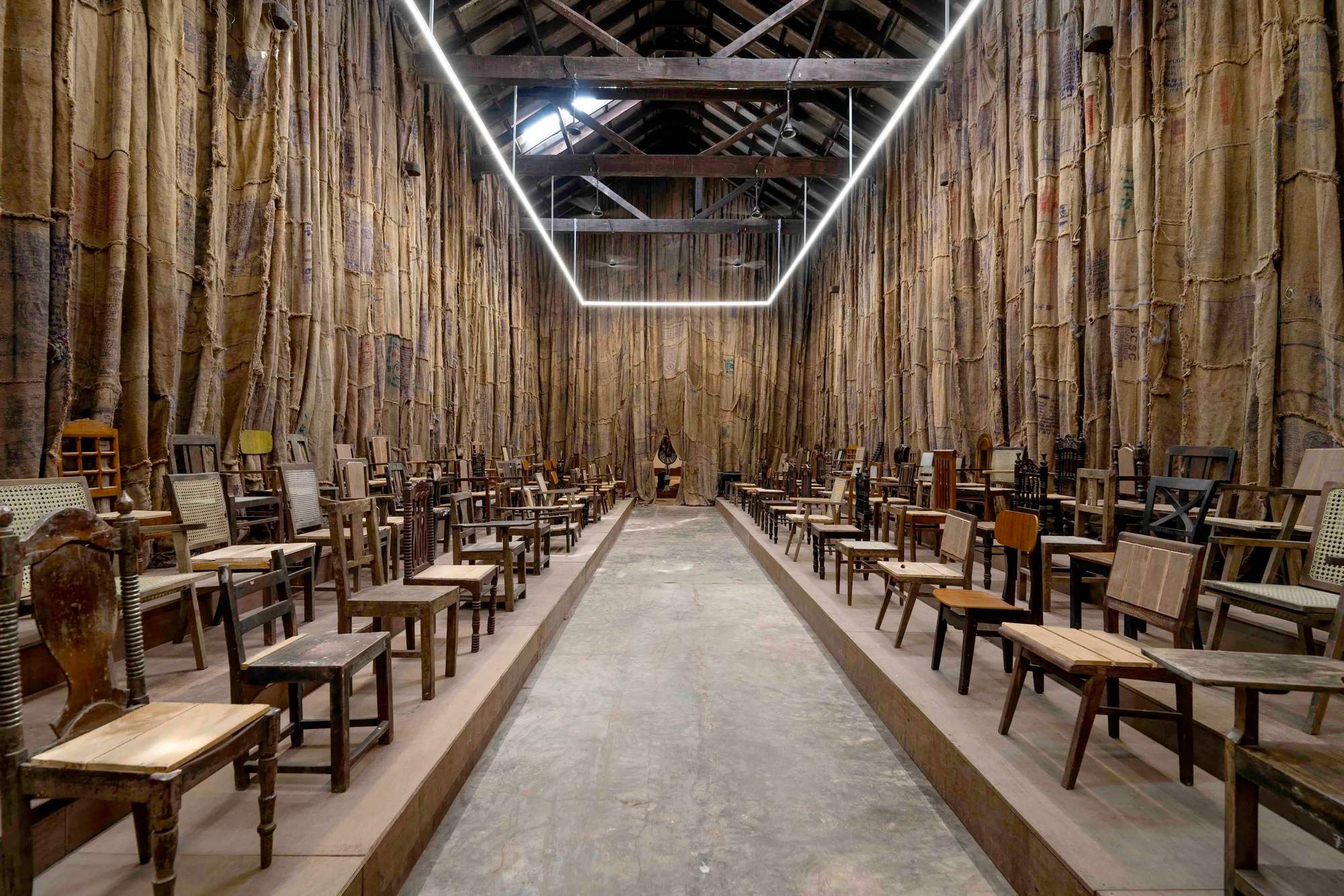Installation views of IBRAHIM MAHAMA’s Parliament of Ghosts, 2017– , at the Anand Warehouse, Mattancherry, Kochi, 2025. Courtesy the Kochi Biennale Foundation.