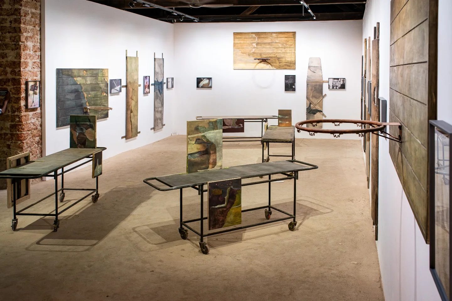 Acclaimed artists associated with the region were featured alongside leading figures from elsewhere, such as Adrián Villar Rojas, Tino Seghal, and Nari Ward, accumulatively offering rich experiential narratives for audiences through many commissioned and site-responsive works. Among the eight venues of the core exhibition, Aspinwall House was the most densely installed, while the new Island Warehouse on Willingdon Island was the most ambitious. Younger voices were ever-present: Ratna Gupta’s poetic sculptures, knitted tapestries, and embroideries drew attention, while Faiza Hasan’s eloquent metal floor drawing of tidal foam evoking the ebb and flow of memory was in perfect concert with the Arabian Sea on view through the window. These glimpses of waterways provided a cadence throughout the biennale journey. As Kirtika Kain’s suspended sheets made of copper plates, jute sacks, and cotton explore the inheritance of the Dalit diaspora, Biraaj Dodiya’s DOOM ORGAN (2025) incorporates clinical steel apparatus, stretchers, paintings, and photographs in an unsettling juxtaposition between the stasis of the mortuary and the dynamism of a competitive sports field.