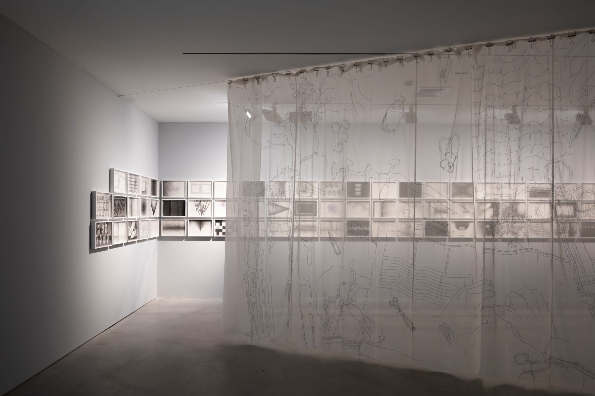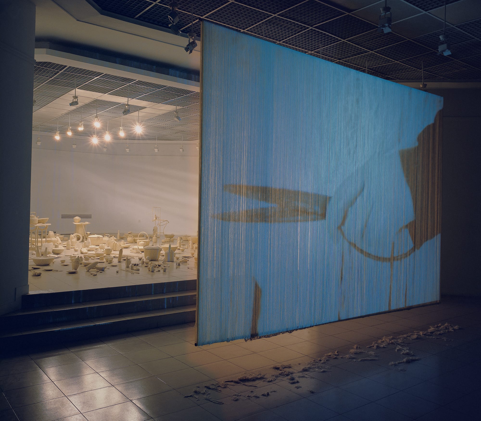 The exhibition—part history, part manifesto—proposed the home as a revolutionary site and positioned domestic life as the theater where existence unfolds as a microcosm. 1.62 meters (2003) offered a poignant synthesis of Lin’s critical preoccupations. White threads stretched across two walls, which were mounted specifically to divide one of the main galleries in half. Visitors were invited to walk beneath the strands, traversing the corridor between the walls. Lin demonstrated how a simple, fragile thread could function as an architectural tool that created intimate environments for introspection.