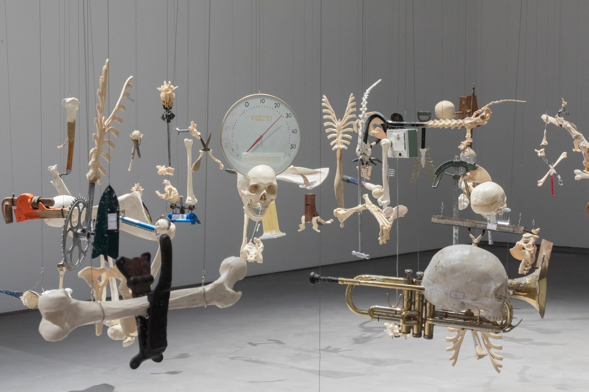 Annotated plans for the exhibition revealed how Lin appropriated the museum’s blueprints, transforming the institutional space into an intimate theater of life. Mirroring Bound and Unbound, Loss & Gain (2014) suspended fragments of synthetic human skeletons and body parts from the ceiling. Here, Lin pushed the show’s central premise to its extreme—the body itself became fractured material. On the floor, shadows cast by disembodied pieces recalled the domestic commodities strewn across the floor of the first gallery. The artist’s struggles with cancer over the past decade permeated the second half of the retrospective, where quotidian objects gave way to medical instruments, extending her consideration of the physicality across different life cycles. Body, object, and home remain inseparable, intertwined in a singular relationship. “There’s No Fun in It!” prompted reflections on an alternative art history, converting the museum into a meditative space that embodies both home and the studio.