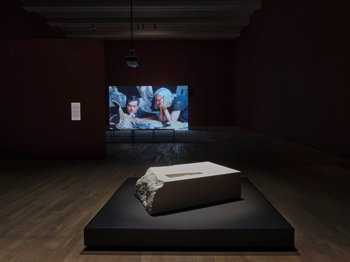 A large photograph of one such polaroid, portraying a patched Greek vase, represents another quiet analog relic, one that can contain hints to help retrace its trafficking journey. The print introduced the next piece, audible in the background: another film, Brennan’s go-to medium and the heart of the show. In An Excavation (2022), the looted object is finally given a voice. The film, like a documentary, shows Greek forensic archeologist Christos Tsirogiannis and Aarhus University Museum director Vinnie Norskov unboxing the remnants of a 2,500-year-old Greek vessel plundered from Southern Italy. Their delicate unpacking of the painted terracotta shards is accompanied by Tsirogiannis calmly explaining that the act of looting robs the objects of their voice due to the loss of the context they were extricated from. He describes his job as a reconstruction of two puzzles at once: the object itself, and its trajectory since the looting. Close-ups of the handling of the pieces emphasize their physicality. Norskov lucidly verbalizes that her hands touching the artefact are a reminder of who else has held it in the past – the potter, the painter, the plunderer…